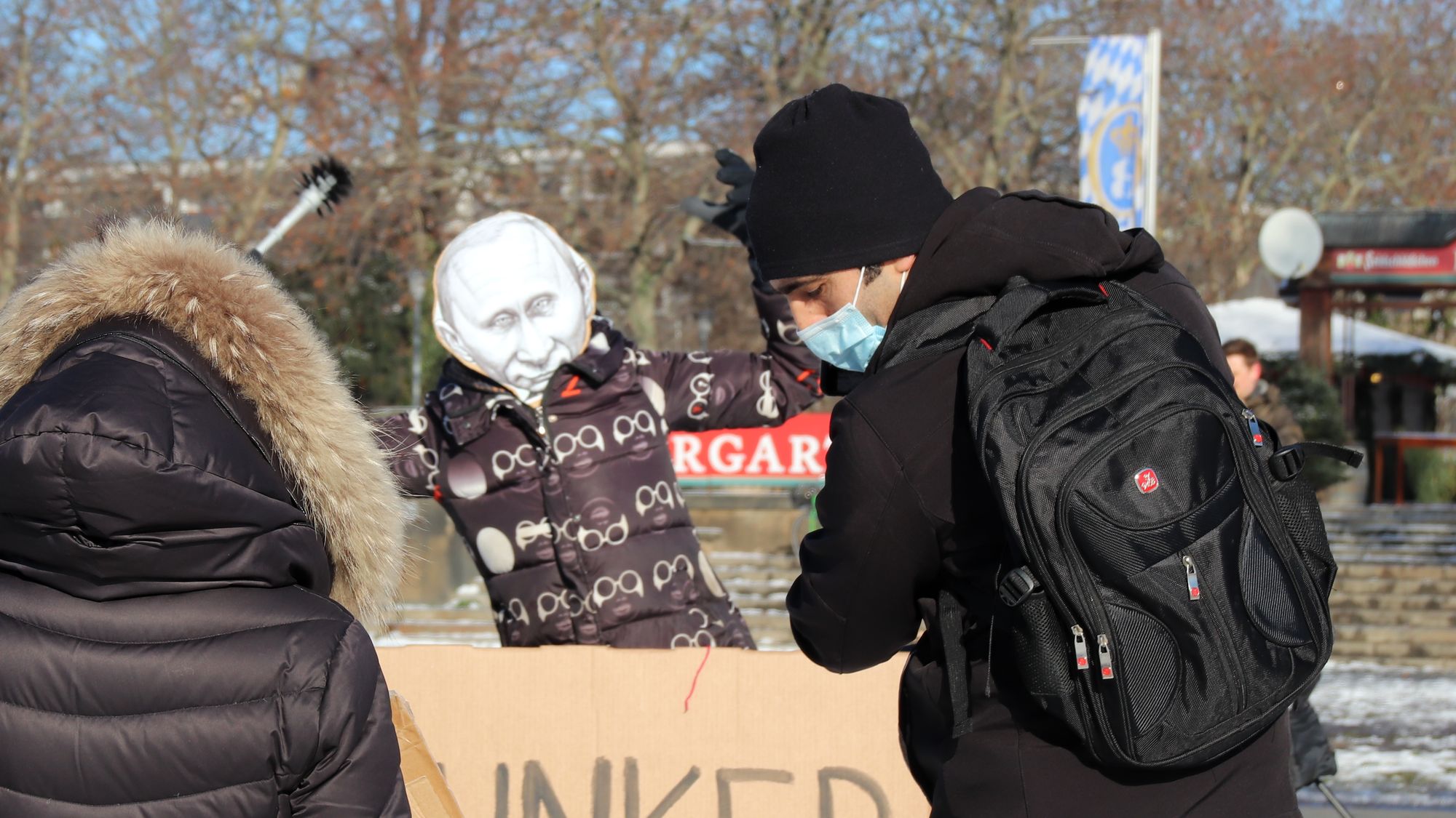 Angemeldet hat die Demonstration Irina Rau. Die gebürtige Russin und Wahldresdnerin führte auch eine kleine Performance auf, in der sie den russischen Präsidenten Wladimir Putin verkörperte, der am Ende in einen Bunker eingesperrt wurde.