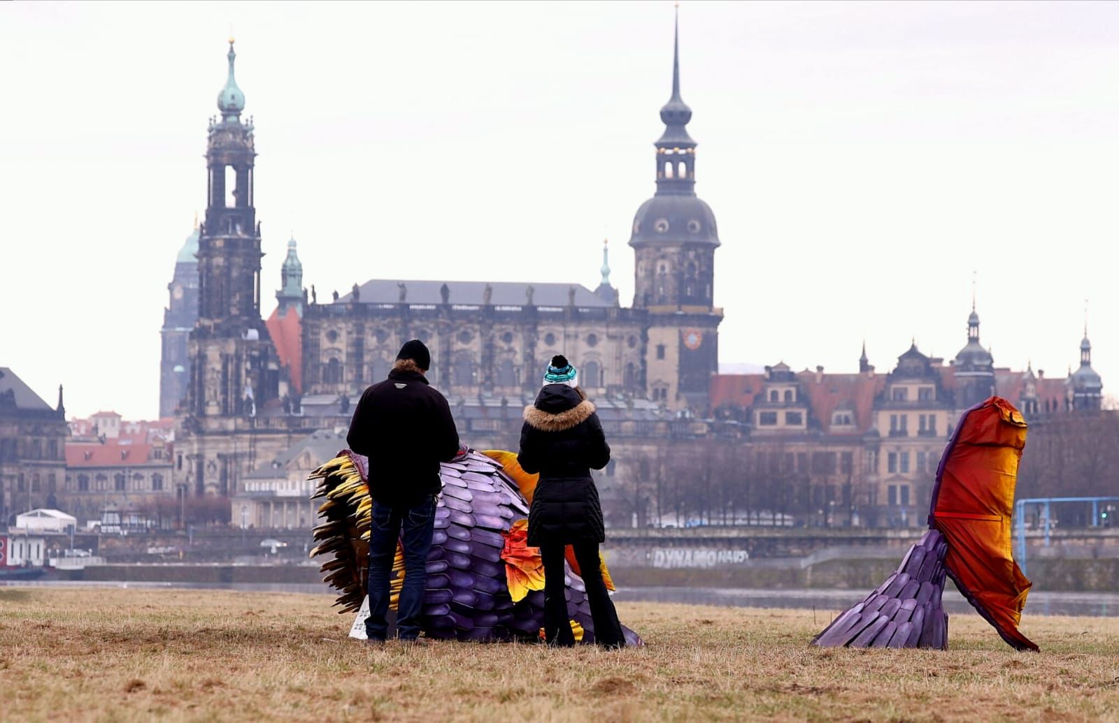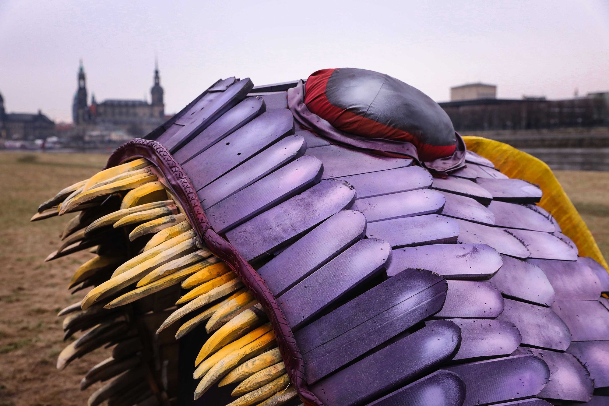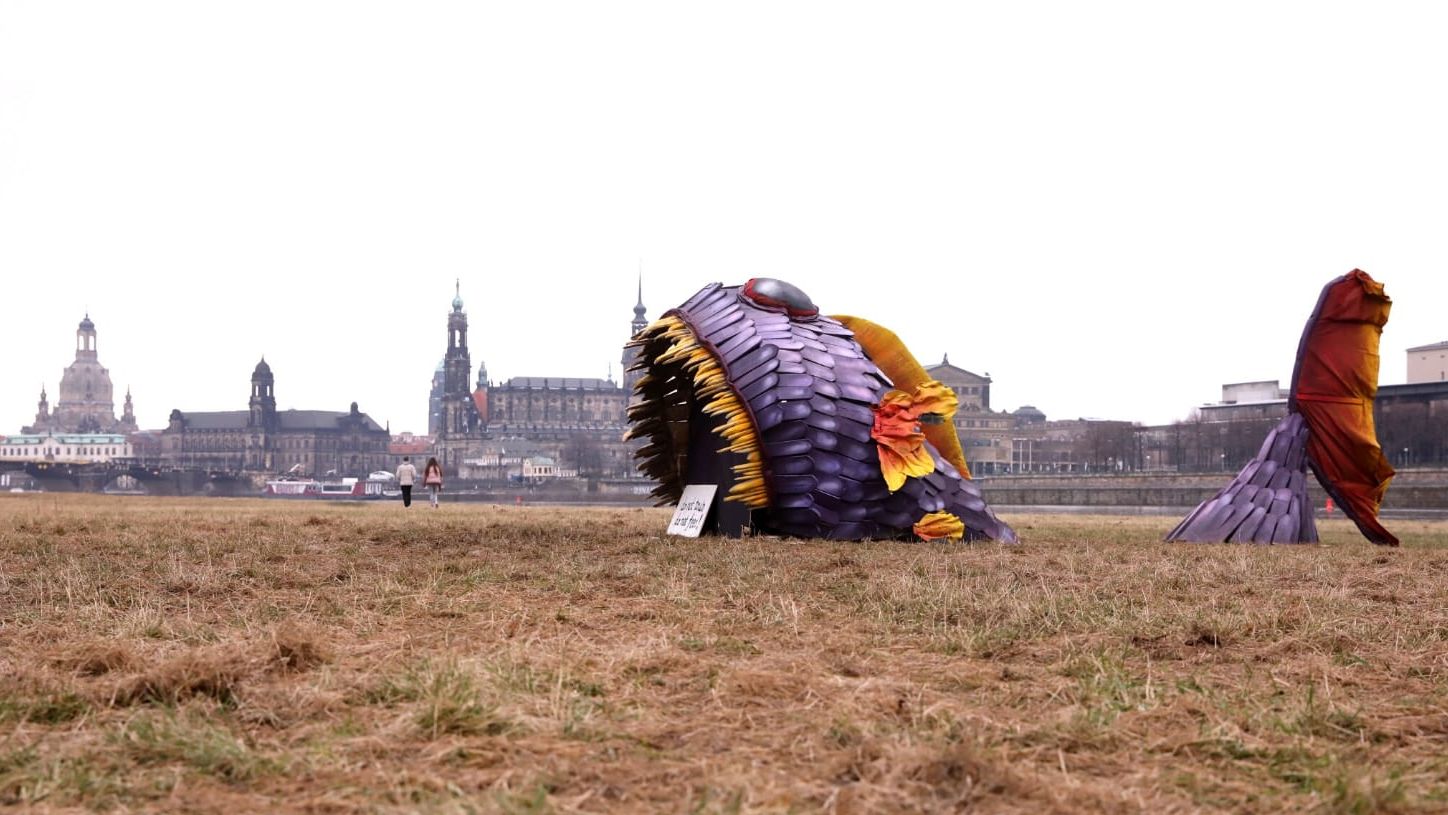 Am Elbufer unterhalb des Japanischen Palais ist ein riesiger kunterbunter Fisch aufgetaucht. Also genau genommen nur der Kopf und die Schwanzflosse. Dafür in wunderbarem Violett und mit scharfen Zähnen. Im Maul des drolligen Tieres steht ein Schild: „do not touch do not feed!“ – also bitte nicht anfassen und nicht füttern.