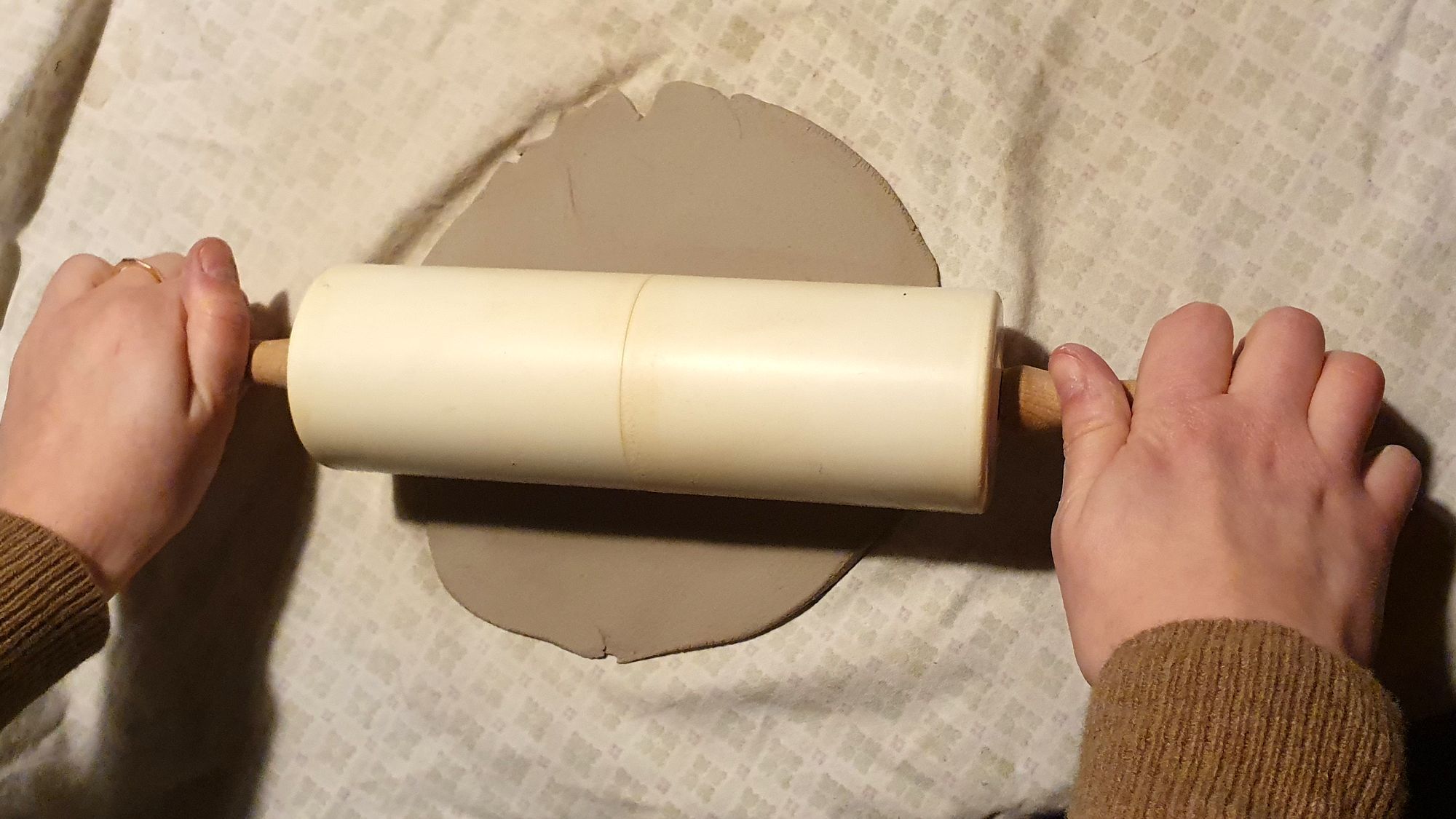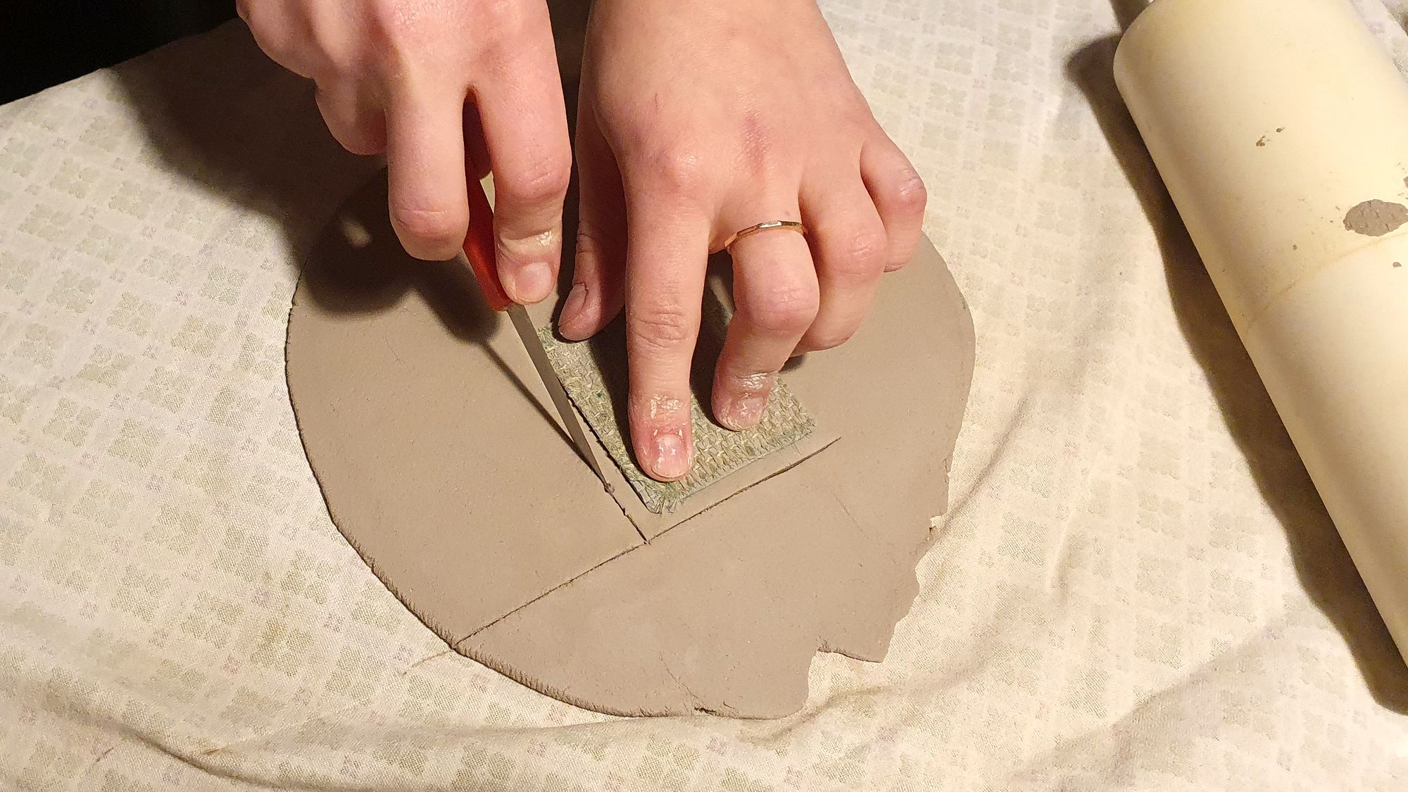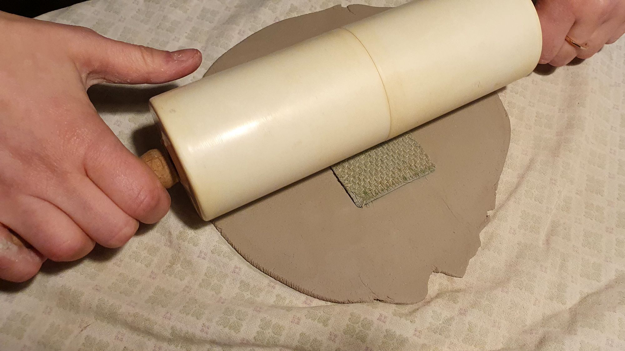 Auf dem Tisch liegt ein Klumpen Ton. Mit einem dünnen Faden trennt sie ein kleines Stückchen ab. Dann haut sie kräftig mit den Fäusten darauf herum, der Ton wird platt gemacht. Dann kommt ein Nudelholz, original DDR von der Großmutter, zum Einsatz. Aus dem Tonklumpen ist jetzt eine wenige Millimeter dünne Scheibe geworden. Nun kommt ein selbstgefertigter Stempel zum Einsatz. „Das ist ein Linolschnitt“, erklärt Katja. Den drückt sie nun fest in den Ton. Vorsichtig rollt sie zwei, dreimal mit dem Nudelholz darüber.