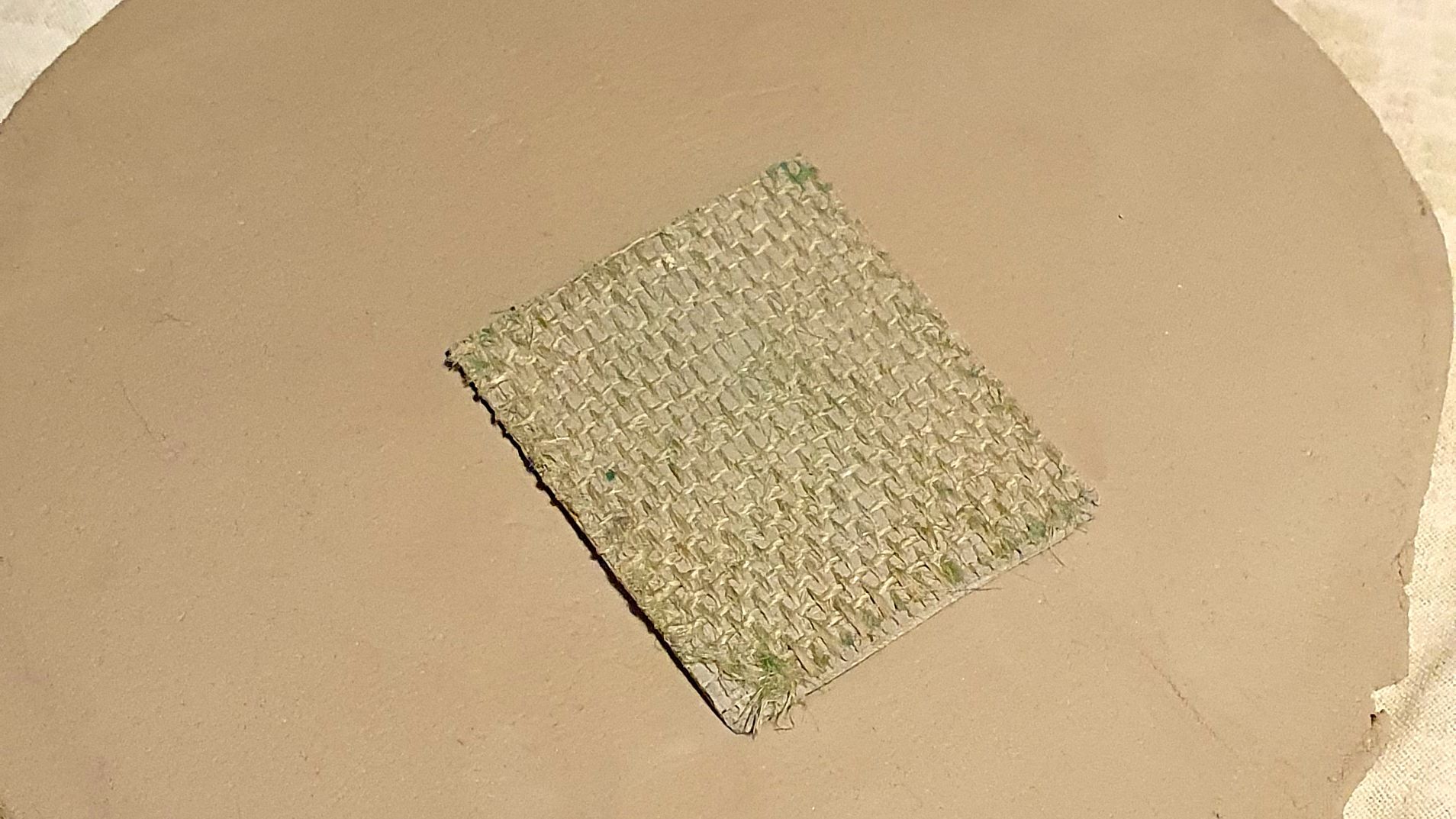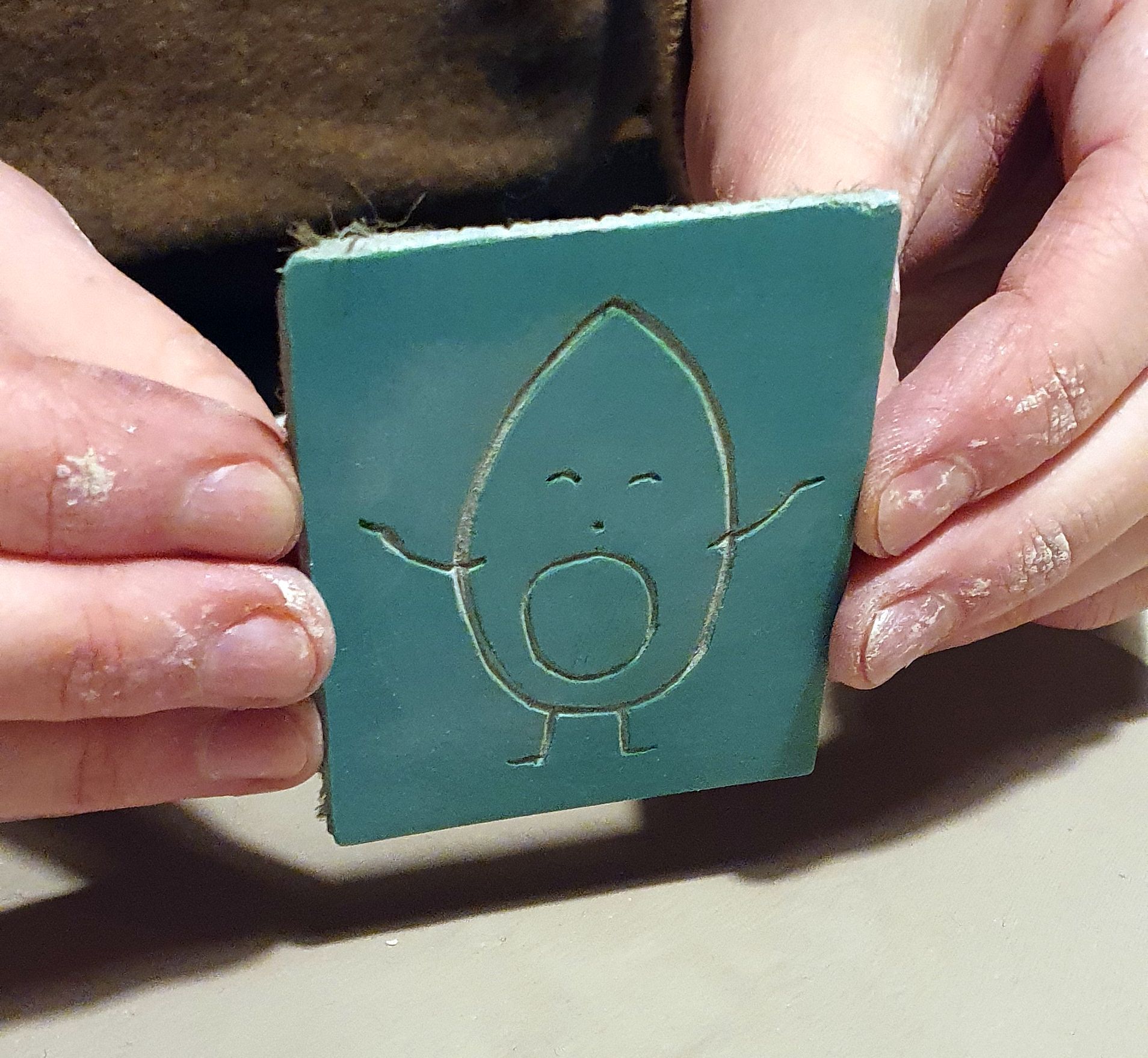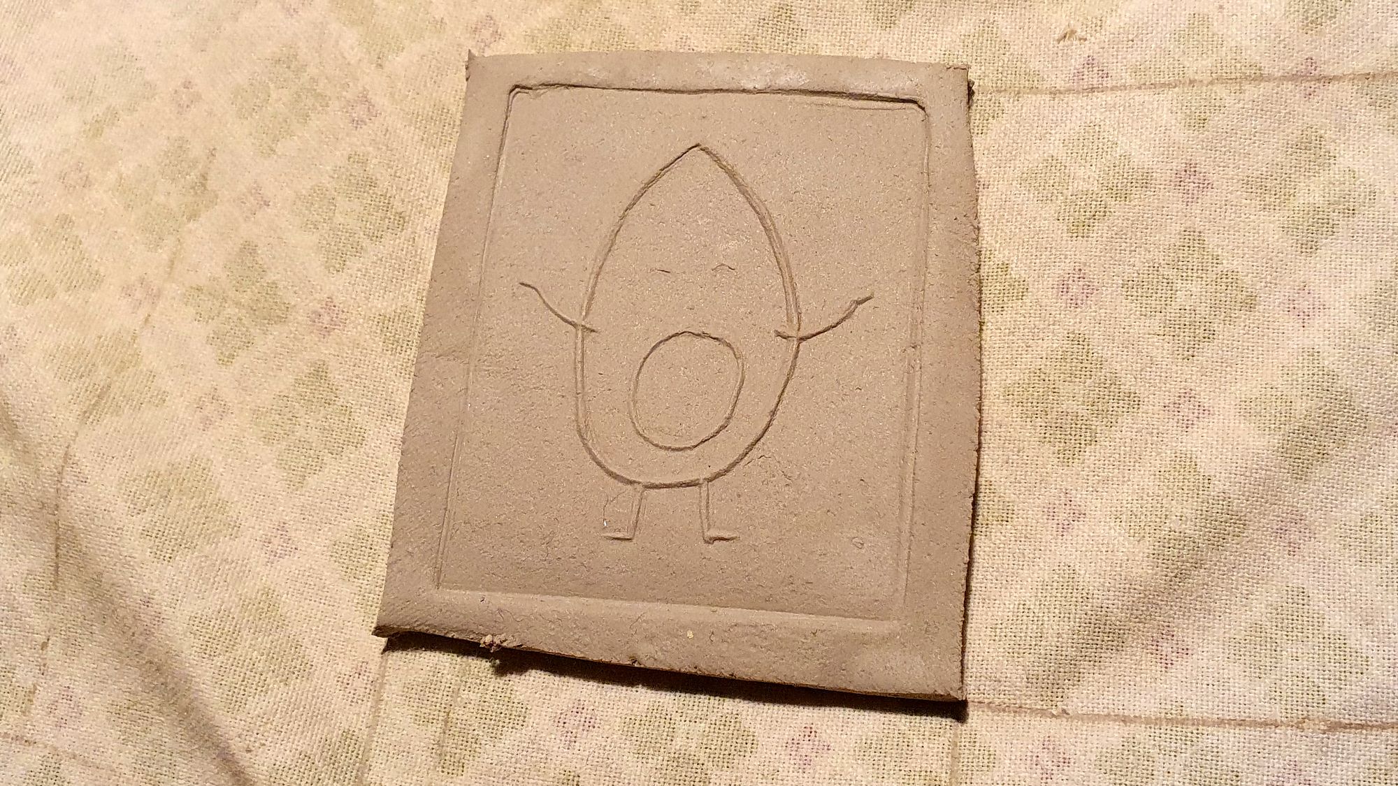 Auf dem Tisch liegt ein Klumpen Ton. Mit einem dünnen Faden trennt sie ein kleines Stückchen ab. Dann haut sie kräftig mit den Fäusten darauf herum, der Ton wird platt gemacht. Dann kommt ein Nudelholz, original DDR von der Großmutter, zum Einsatz. Aus dem Tonklumpen ist jetzt eine wenige Millimeter dünne Scheibe geworden. Nun kommt ein selbstgefertigter Stempel zum Einsatz. „Das ist ein Linolschnitt“, erklärt Katja. Den drückt sie nun fest in den Ton. Vorsichtig rollt sie zwei, dreimal mit dem Nudelholz darüber.
