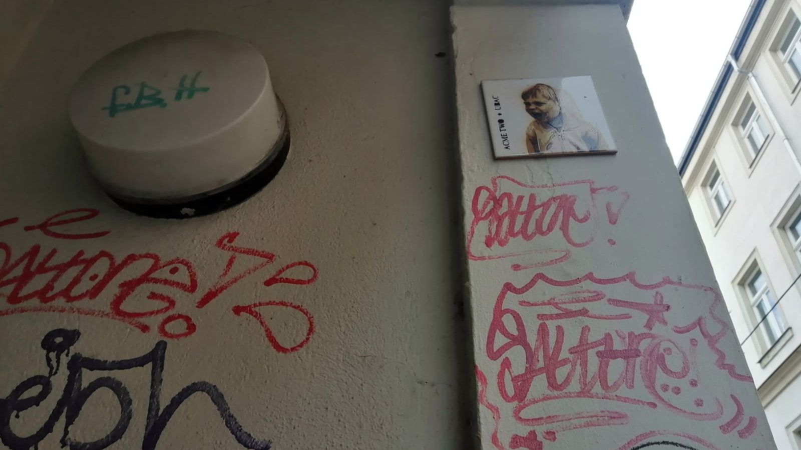 Interessant an dieser Fliese ist, dass hier offenbar ein Foto aufgebracht wurde, diese Technik ist vergleichsweise selten zu sehen. Die Beschriftung ACME TWO UBAC ist ein deutlicher Hinweis auf die Urheberschaft, denn mit der Künstlerkennzeichnung Jo Ubac Krew (acmetwo) gibt es eine Facebook-Site mit interessanten Kunstwerken, der schreiende Junge ist dort auch dabei. Auch auf Instagram finden sich Bilder mit dem Hashtag acmetwo.