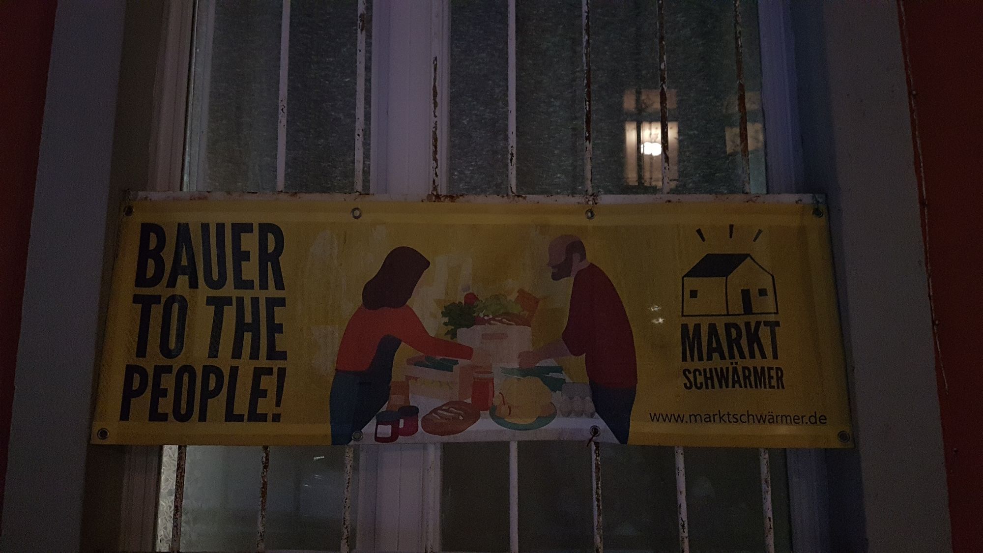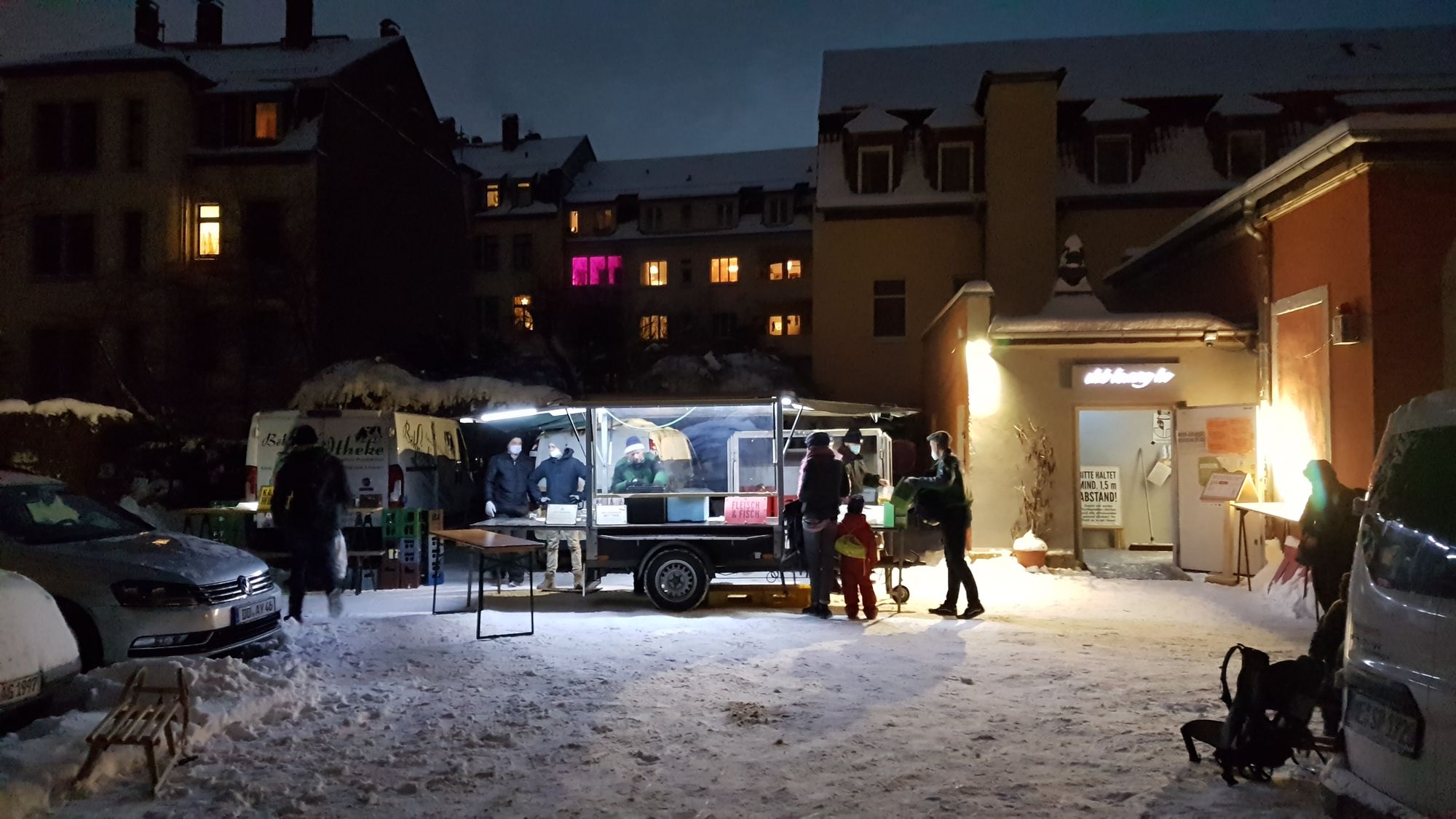 Angezogen vom hellen Schein stapfen die ersten Marktschwärmer wacker üben den knirschenden Schnee. Sie kommen, um ihre Lebensmittel von der „Schwärmerei“ abzuholen. Eine Schwärmerei ist hierbei nicht unbedingt eine Romanze, schon jedoch der Ort, an dem sich Produzent*innen und Konsument*innen von Lebensmitteln näherkommen sollen.