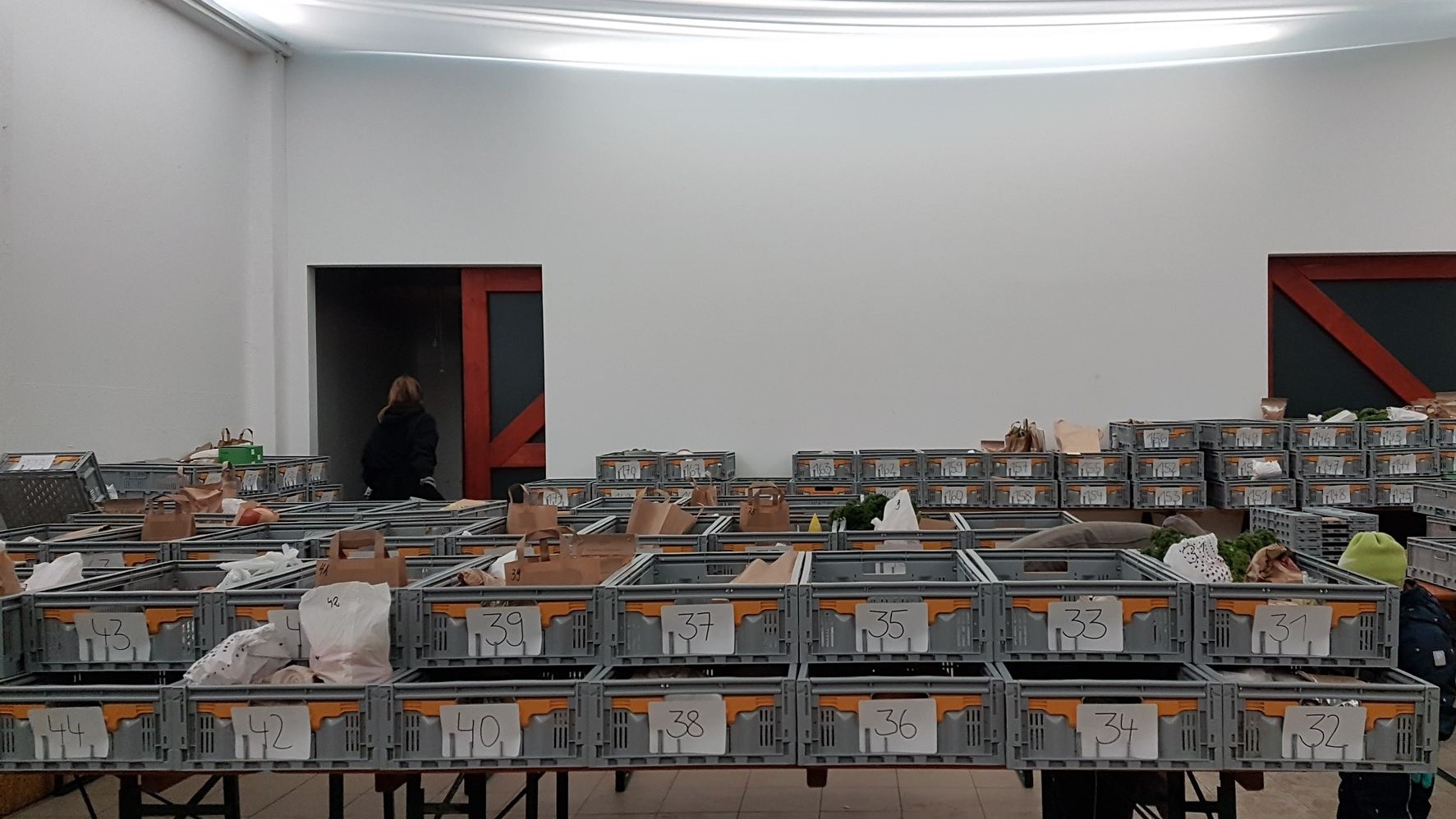 Drinnen stapeln sich die auf Biertischen aufgebauten Lebensmittelkisten. Doch all das hat System, die über 200 Kisten sind fein-säuberlich nach Bestellnummer sortiert. So soll garantiert werden, dass jede*r schnell zur gewünschten Kiste kommt und die Abholung so kontaktlos wie möglich verläuft.