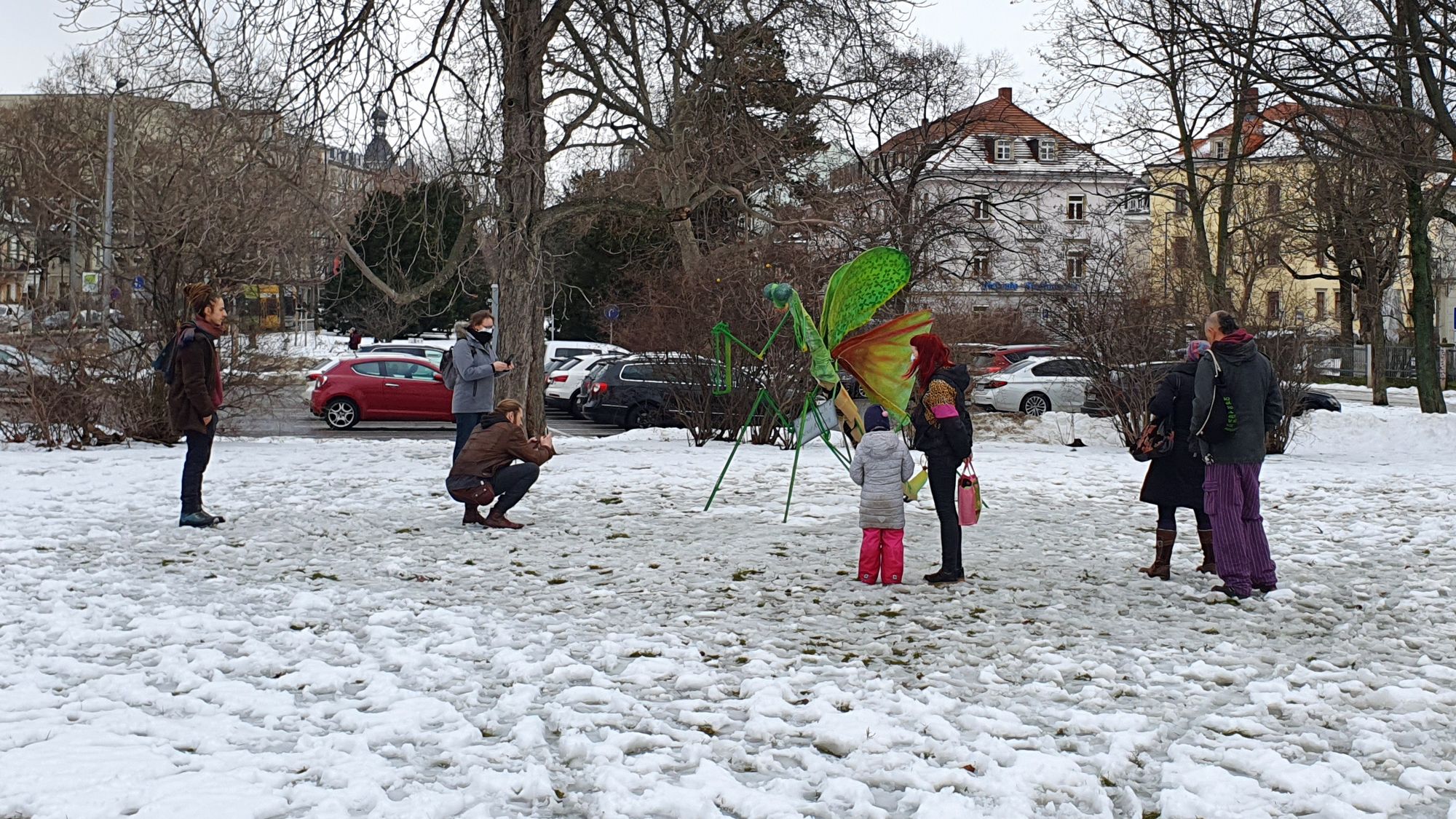 Die Heuschrecke am Albertplatz ist inzwischen schon zu einer kleinen Attraktion geworden. Rundherum versammeln sich fotografierende Erwachsene und staunende Kinder. Beim Aufbau in der Nacht war offenbar ein Kamerateam von Sachsen-Fernsehen dabei. Dem verrieten die Künstler auch den Namen des Tieres: „Baszd Meg Pillangó“ – das ist ungarisch und heißt zu deutsch in etwa „Fick Dich, Schmetterling“.