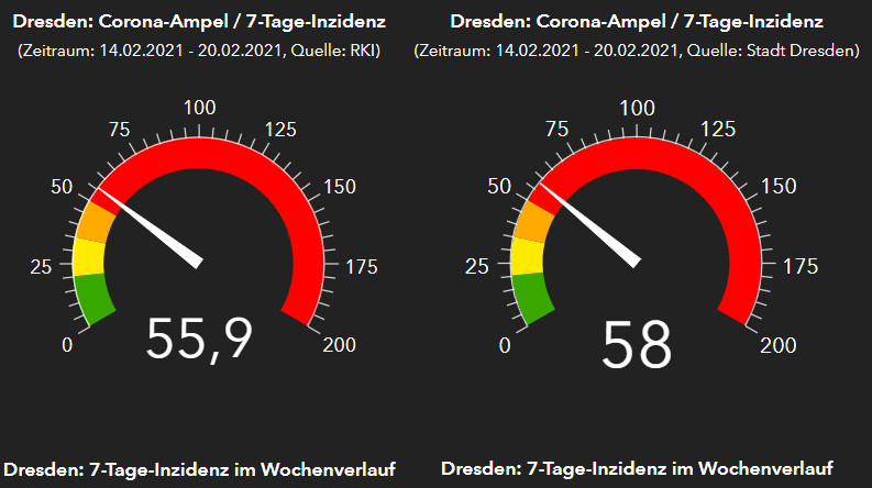 Die Stadtverwaltung zeigt auf dresden.de seit Anfang Dezember zwei Corona-Ampeln. Die eine zeigt das aktuelle Infektionsgeschehen, wie es beim Gesundheitsamt gemeldet wird an, die andere den Stand des RKI. Die RKI-Ampel ist für eventuelle Einschränkungen oder deren Aufhebung wichtig. Die RKI-Ampel ist in den vergangenen Wochen immer geringer ausgefallen als die Ampel vom Gesundheitsamt. Diese zeigt jetzt bereits seit fünf Tagen in Folge einen Wert unter 100 an. Angezeigt wird jeweils, wie viele Fälle es pro 100.000 Einwohner in Dresden in den vergangenen sieben Tagen gab.
