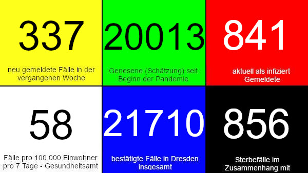 Das Dresdner Gesundheitsamt meldet mit Stand heute 12 Uhr für die vergangene Woche 337 Neuinfektionen, das ist etwas mehr als in der Vorwoche, die Corona-Ampel zeigt auf „Rot“, 31 Personen wurden in der vergangenen Woche neu in ein Krankenhaus aufgenommen, 4 Personen verstarben laut Totenschein an einer Covid-19-Erkrankung.