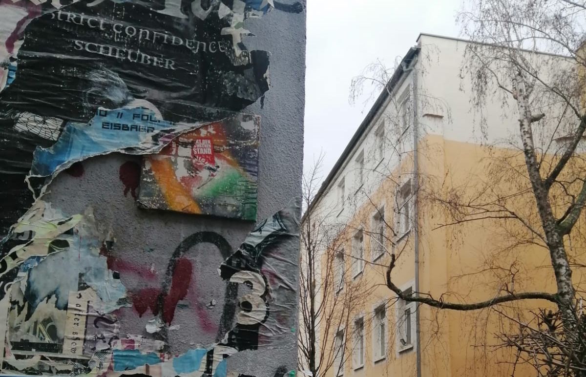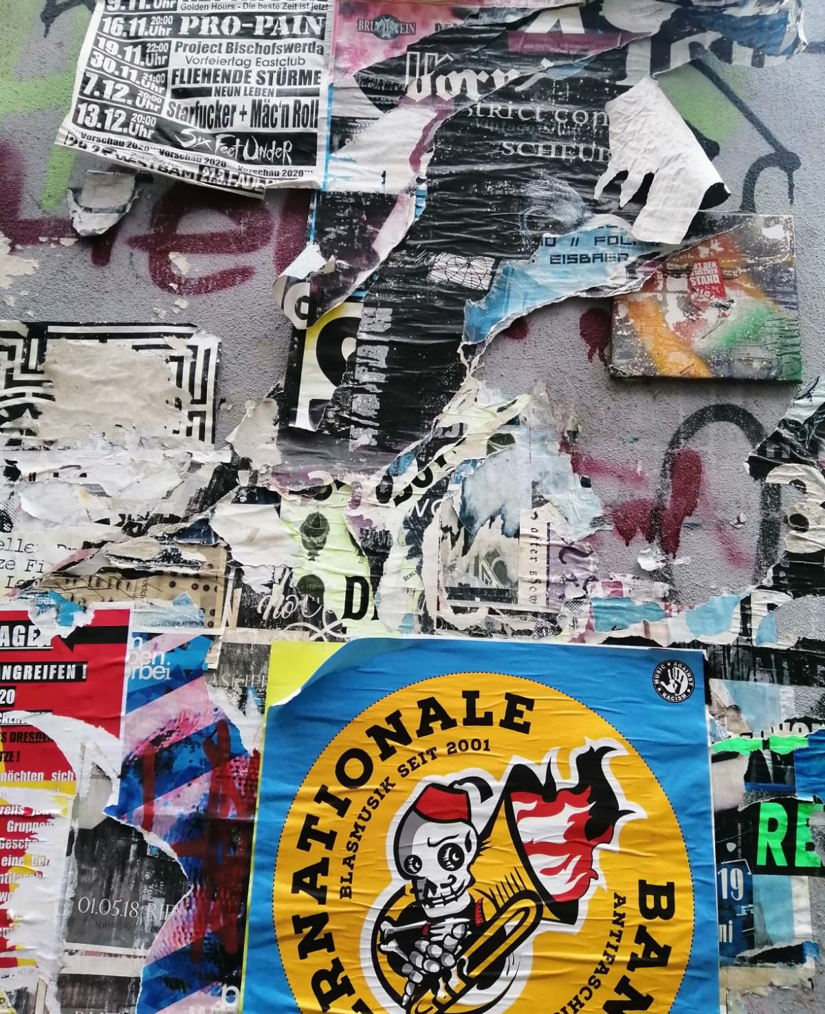 Die Wild-Kleber, die ihre Plakate an die Hauswände kleistern, nehmen offenbar auch nicht immer Rücksicht auf die Kleinkunst an der Wand. Dieses mehrfarbige Werk hier wurde offenbar wiederholt überklebt. Jedoch nicht nur von Plakatierern, sondern auch von politischen Botschaftern, der Rest „rt den stischen stand“ lässt die Message erahnen. Dabei ist die Fliese mit ihren inzwischen schon abgeblätterten Farbverläufen durchaus ein Hingucker. Nur sieht man sie inmitten der kunterbunten Wand gar nicht mehr.