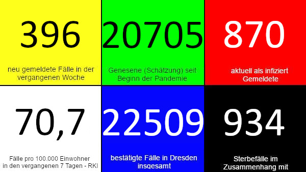 Das Dresdner Gesundheitsamt meldet mit Stand heute, 7. März 2021, 12 Uhr für die vergangene Woche 396 Neuinfektionen, das sind etwas mehr als in der Vorwoche, die Corona-Ampel des RKI zeigt auf „Rot“, 32 Personen wurden in der vergangenen Woche neu in ein Krankenhaus aufgenommen, eine Person verstarb laut Totenschein an einer Covid-19-Erkrankung.