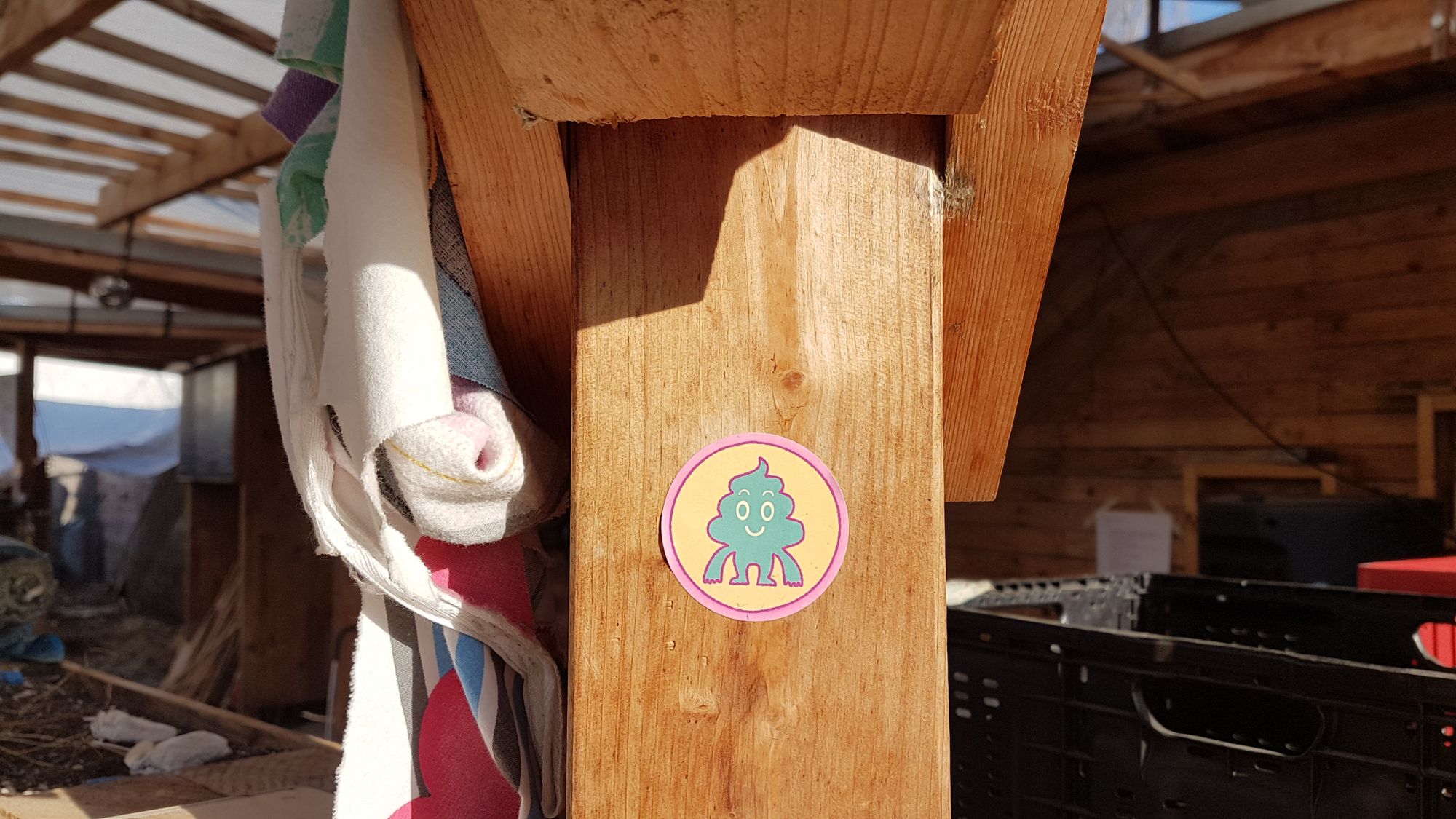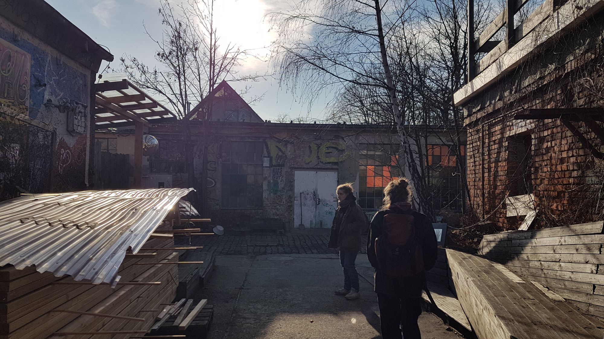Hannah und Nats beide schon lange beim Palais Palett e.V. dabei, schlendern gerade am Zaun entlang. Sie führen über den Hof, routiniert sperren sie die unscheinbare Holztür auf und der Eingangsbereich des OKA empfängt seine Gäste.