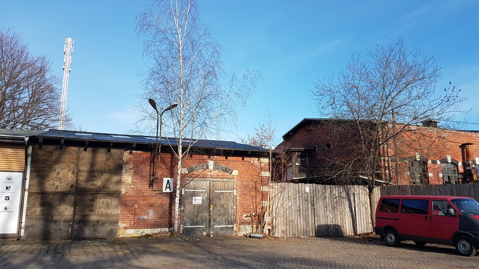 Auf dem Rad geht es ins Industriegelände. Rot leuchtend heben sich die Backsteine des „Objekt klein a“ (OKA) vom tiefblauen Märzhimmel ab.