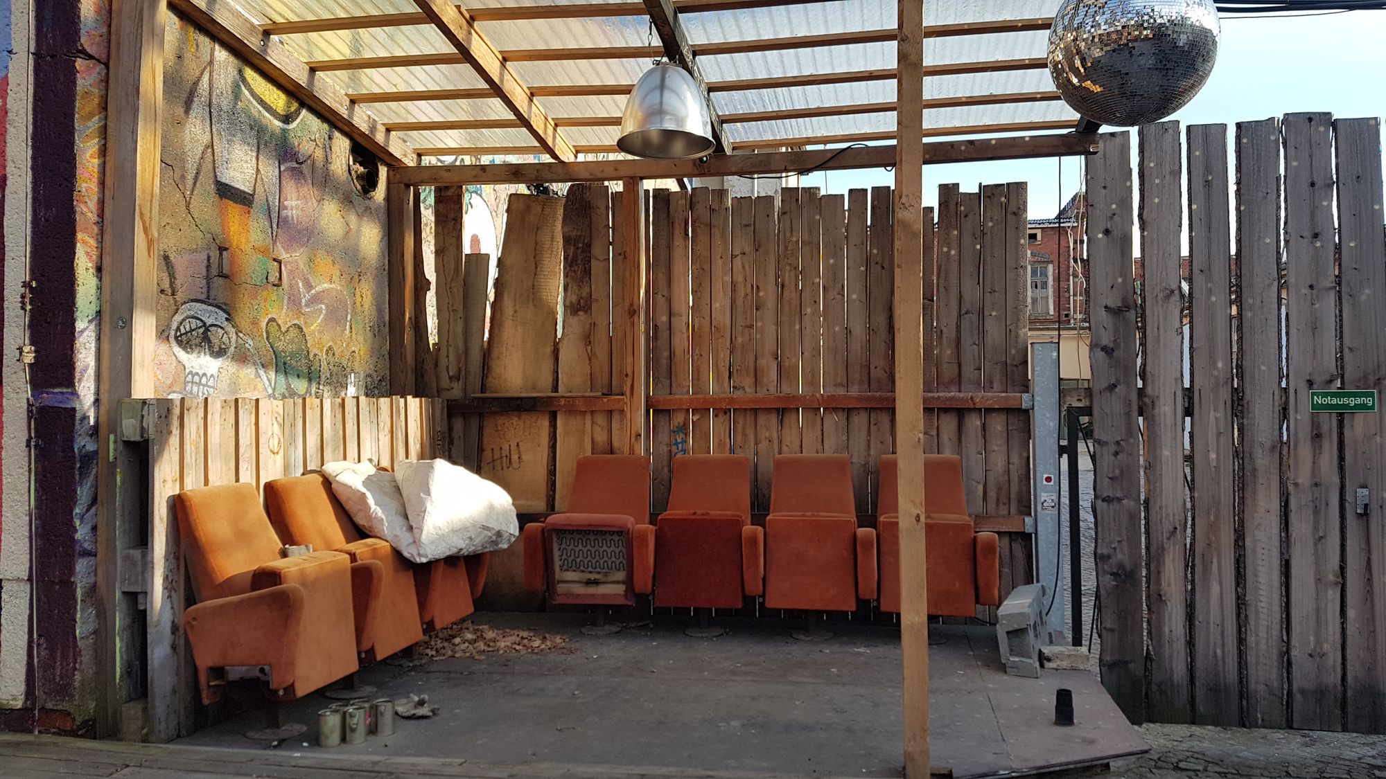 Dem pandemiebedingt an neuen Reizen ausgehungerten Betrachter zeigt sich hier ein Anblick irgendwo zwischen Baustelle, Kunstausstellung, und dem Bauwagen von Pettersson und Findus: Kisten, Kinosessel, Dosen, Besen, Kübel, Graffitis, eine Diskokugel, Holzbänke und Kunstgebilde, man merkt sofort: hier steckt viel Herzblut drin.