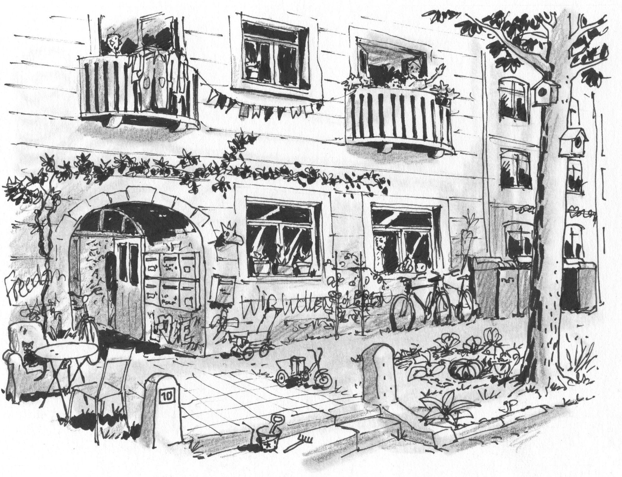 In den Treppen und den Gängen: noch ein paar Fahrräder, die manchmal am Geländer hängen; grüne Pflanzen an den Fensterbrettern, die allen gehören müssen; Schuhregale, Bierkästen, Pfandglas oder Papiermüllkartons. An den Wänden: Posters, Kinderzeichnungen und „Hier leben: … “ Aufkleber, die jedem Wohnungseingang eine persönliche Note geben. So viele Beweise von Leben und Austausch. Im Treppenhaus unsanierter Altbauten, in denen man noch mit einem Ofen heizt und es so schön nach Feuer riecht, steht ein Eimer mit Asche vor jeder Fußmatte.