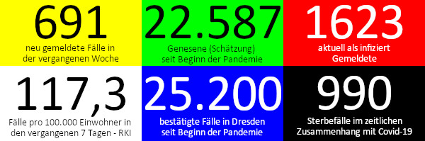 Die Corona-Ampel des Robert Koch-Instituts zeigt immer die letzten sieben Tage an. Also heute vom vergangenen Sonntag bis Sonnabend. Am Sonntag, dem 4. April 2021 zeigte die Ampel weiterhin auf rot mit einer 7-Tage-Inzidenz von 117,3. Eine Personen ist laut Totenschein in der vergangenen Woche im zeitlichen Zusammenhang mit einer Covid-19-Erkrankung verstorben. Offenbar wurden aber noch weitere 8 Todesfälle aus vorherigen Wochen nachgemeldet. Insgesamt werden in Dresden nun 990 Todesfälle im Zusammenhang mit Covid-19 verzeichnet.