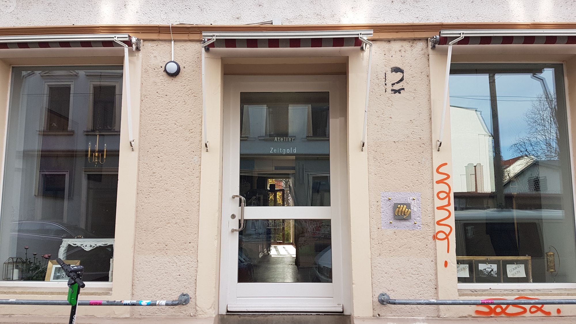 Etwas versteckt liegt das Atelier Zeitgold an der Rothenburger. Zwei große Fenster und eine Glastür lassen den neugierigen Blick ins Innere lugen. Einzig ein mit Kreide aufgemalter Schriftzug auf der Glastür verweist auf den Laden selbst. Beim Betreten riecht es nach frischer Farbe, an den hohen, weißen Wänden hängen eine Handvoll Bilder lokaler Künstler, mehr sollen noch geliefert werden.