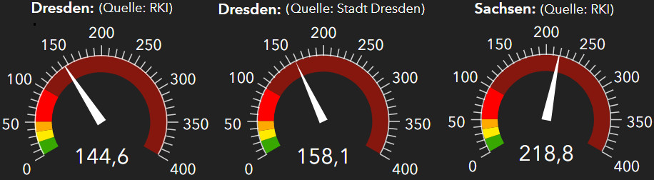 Die Stadtverwaltung zeigt auf dresden.de seit Mitte Februar drei Corona-Ampeln. Die eine zeigt das aktuelle Infektionsgeschehen, wie es beim Gesundheitsamt gemeldet wird an, die andere den Stand des RKI, die dritte die RKI-Zahlen für Sachsen.