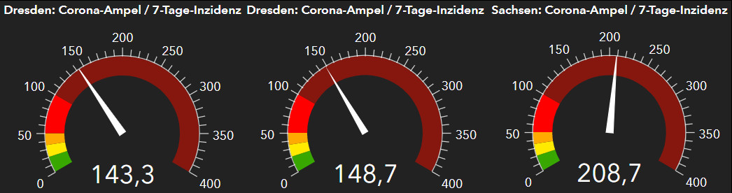 Die Stadtverwaltung zeigt auf dresden.de seit Mitte Februar drei Corona-Ampeln. Die eine zeigt das aktuelle Infektionsgeschehen, wie es beim Gesundheitsamt gemeldet wird an, die andere den Stand des RKI, die dritte die RKI-Zahlen für Sachsen.