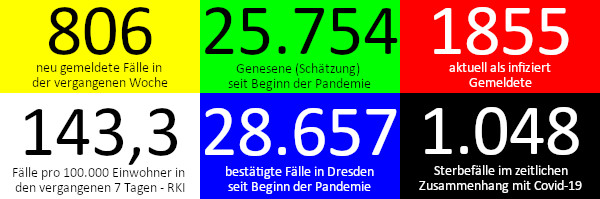 Das Dresdner Gesundheitsamt meldet mit Stand heute, 2. Mai 2021, 12 Uhr für die vergangene Woche 806 Neuinfektionen, das sind rund 60 weniger als in der Vorwoche, die Corona-Ampel des RKI zeigt auf „Rot“, 61 Personen wurden in der vergangenen Woche neu in ein Krankenhaus aufgenommen, eine Person verstarb laut Totenschein im zeitlichen Zusammenhang mit einer Covid-19-Erkrankung.