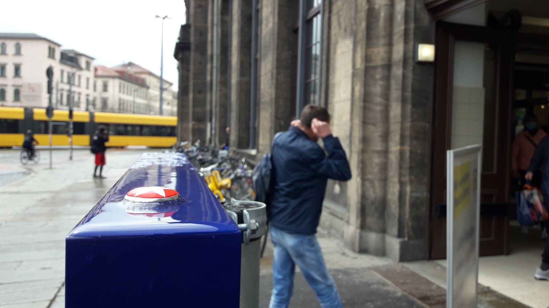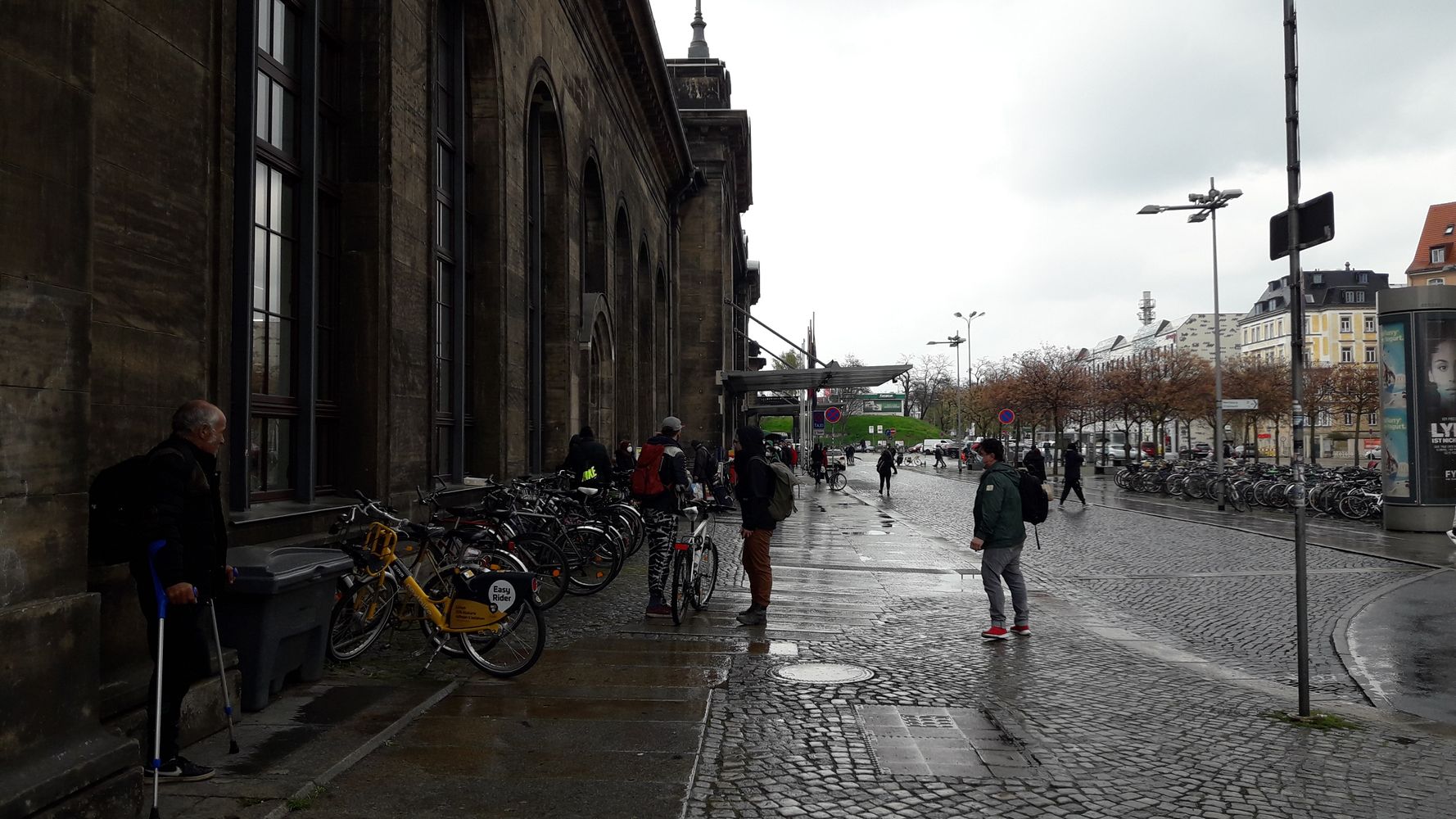 Aus den grauen Wolken fällt Nieselregen auf den Beton. Die Luft ist frisch und kalt, der Wind weht böig über den Bahnhofsvorplatz. Eine gelbe Straßenbahn rattert vorbei, daneben rauschen Autos über den nassen Asphalt. Es riecht nach Regen.
