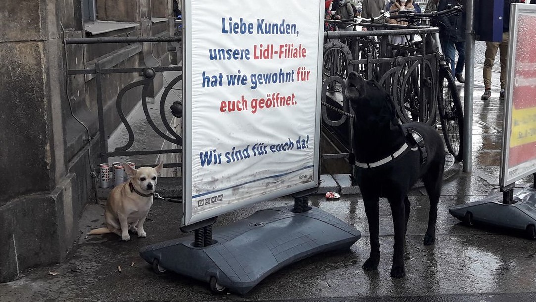Mittlerweile hat der Hund aufgehört zu bellen. Der Mann mit den Krücken raucht und schaut noch immer. Der Bettler kam nicht wieder. Der Lidl-Mitarbeiter hat niemanden erreicht. Er scheint schnell eine Nachricht in sein Telefon zu tippen, dann tritt er die halbgerauchte Zigarette aus und geht in den Laden, um sich den wartenden, schweigenden Massen zu stellen.