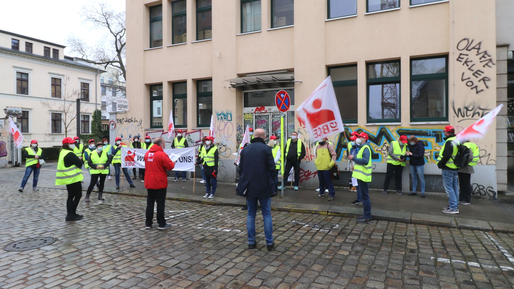 Rund 30 Personen standen heute früh vor der Zahnpastafabrik auf der Katharinenstraße. Die Industriegewerkschaft Bergbau, Chemie, Energie (IG BCE) hat nach den Ausständen im vergangenen Herbst und im März erneut zum Warnstreik aufgerufen.