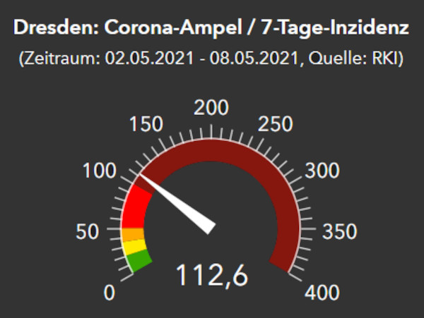 Die Corona-Ampel des Robert Koch-Instituts zeigt immer die letzten sieben Tage an. Also heute vom vergangenen Sonntag bis Sonnabend. Am Sonntag, dem 9. Mai 2021 zeigte die Ampel weiterhin auf rot mit einer 7-Tage-Inzidenz von 112,6. Der für weitere Einschränkungen kritische Wert von 150 wurde in der vergangenen Woche nicht überschritten. Weitere Lockerungen sind möglich, wenn der Wert von 100 für fünf Tage in Folge unterschritten wird. Zwei Personen sind laut Totenschein in der vergangenen Woche im zeitlichen Zusammenhang mit einer Covid-19-Erkrankung verstorben. Offenbar wurden weitere 5 Todesfälle aus vorherigen Wochen nachgemeldet. Insgesamt werden in Dresden nun 1055 Todesfälle im Zusammenhang mit Covid-19 verzeichnet.