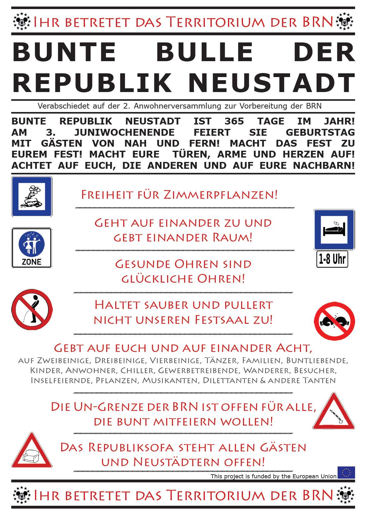 Nach schier endlosen Schwafelrunden ist die Bunte Bulle zur zweiten Anwohnerversammlung am 5. Juni verabschiedet worden. Sie ist wesentlich bunter und bulliger als die Ausgabe des Vorjahres und gilt als (Un)Verfassung der Republik.