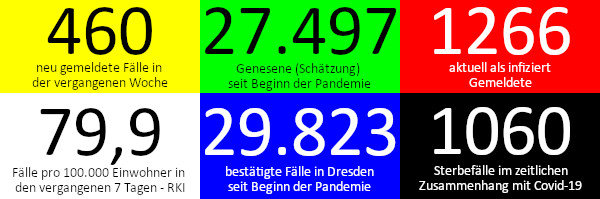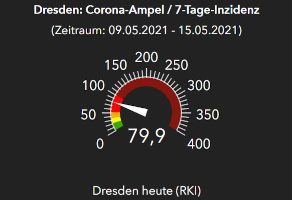Das Dresdner Gesundheitsamt meldet mit Stand heute, 16. Mai 2021, 12 Uhr für die vergangene Woche 460 Neuinfektionen, das sind rund 220 weniger als in der Vorwoche, die Corona-Ampel des RKI zeigt auf „Rot“, 33 Personen wurden in der vergangenen Woche neu in ein Krankenhaus aufgenommen, es wurde kein Todesfall im zeitlichen Zusammenhang mit einer Covid-19-Erkrankung gemeldet.