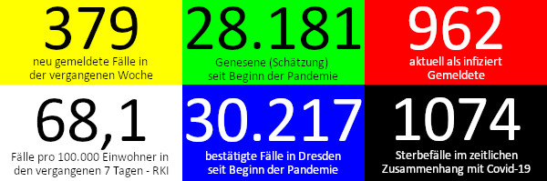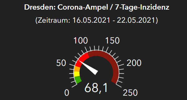 Das Dresdner Gesundheitsamt meldet mit Stand heute, 23. Mai 2021, 12 Uhr für die vergangene Woche 379 Neuinfektionen, das sind rund 80 weniger als in der Vorwoche, die Corona-Ampel des RKI zeigt auf „Rot“, 35 Personen wurden in der vergangenen Woche neu in ein Krankenhaus aufgenommen, es wurde kein Todesfall im zeitlichen Zusammenhang mit einer Covid-19-Erkrankung gemeldet.