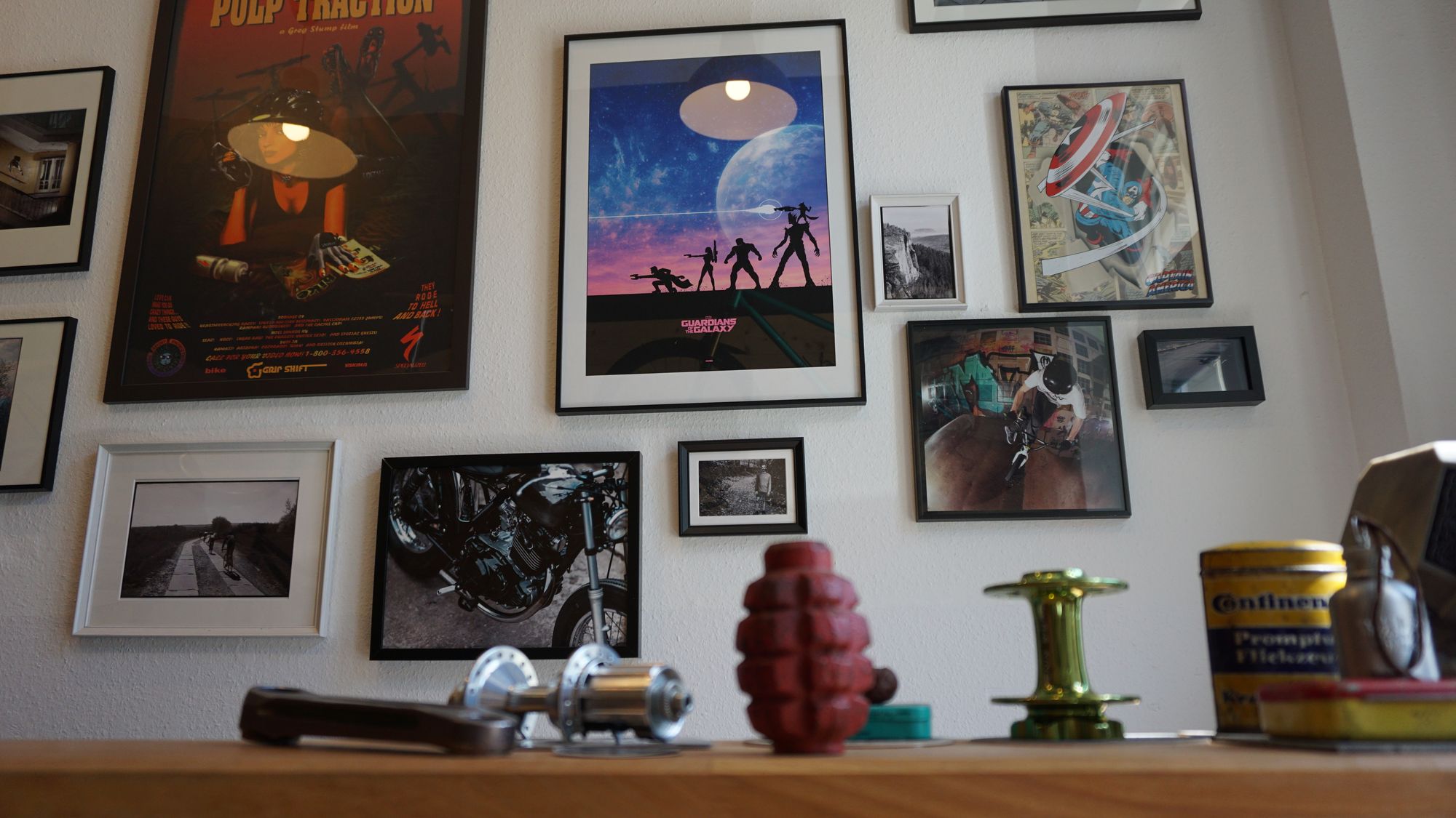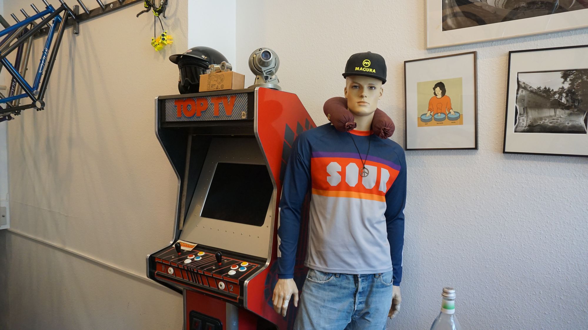 Linkerhand hängen einige ebenso sportliche Fahrräder von der holzvertäfelten Wand. Rechterhand ist ein Tresen aufgebaut, dahinter einige gerahmte Bilder vom Fahrrad und der Popkultur.