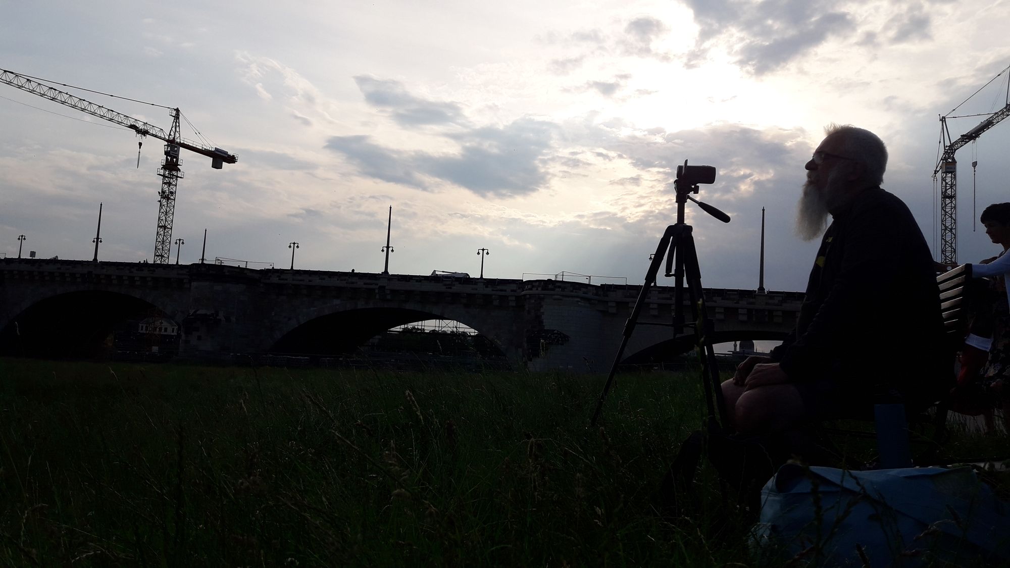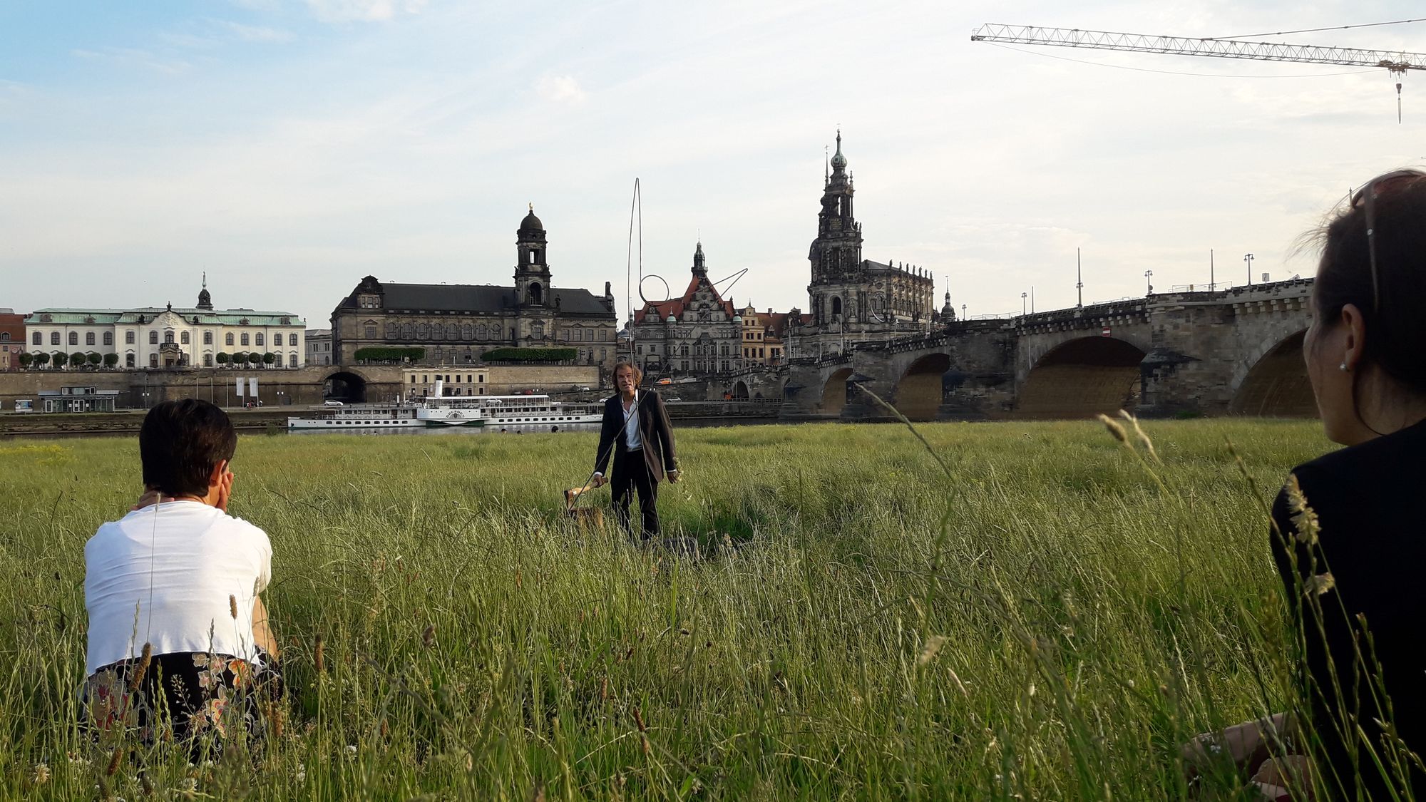 Jetzt schreitet er auf und ab. Wann immer ein Schauspieler dem Publikum nahe kommt, entsteht eine gewisse Spannung, insbesondere wenn er eine Axt in der Hand hält. Hin und wieder bricht die Sonne aus den Wolken und taucht die Bühne in goldenes Abendlicht. Dann wieder verdunkelt sich die Szenerie. Mutter Natur macht das Licht. Das Panorama Dresdens dient als Hintergrund.