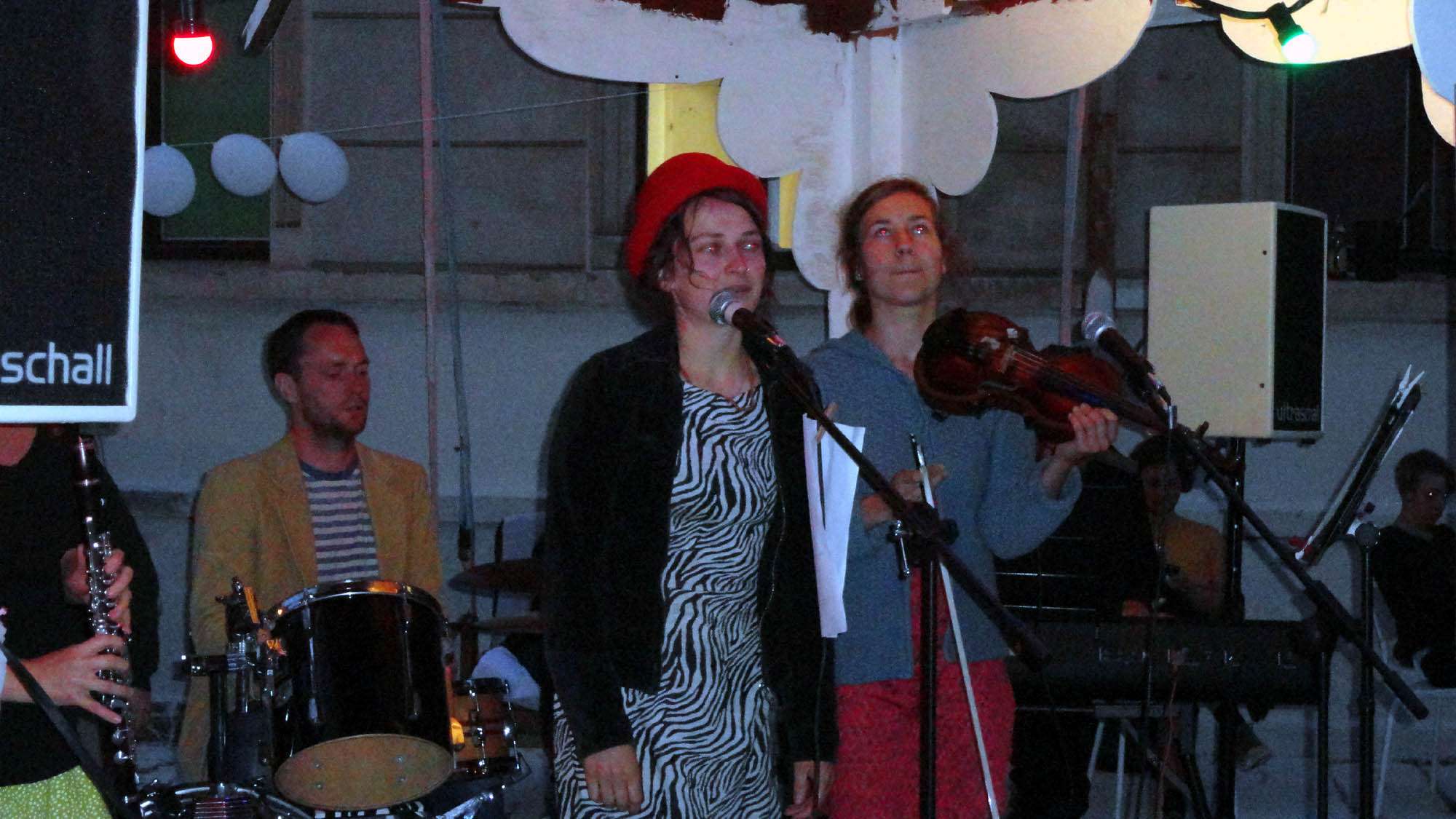 Nächstes Ziel Kukulida auf der Martin-Luther-Straße. Hier ist gerade die Edith-Böhm-Combo zugange, herrlich melancholischer Gesang. Eine wunderschöne junge Frau in Weiß tanzt vor der Bühne, ihren Sohn hält sie im Arm. Wir sind trotz der traurigen Musik glücklich. Hier ist es schön. Heute soll es hier noch eine Farbenschlacht geben, dass ist Bunte Republik.