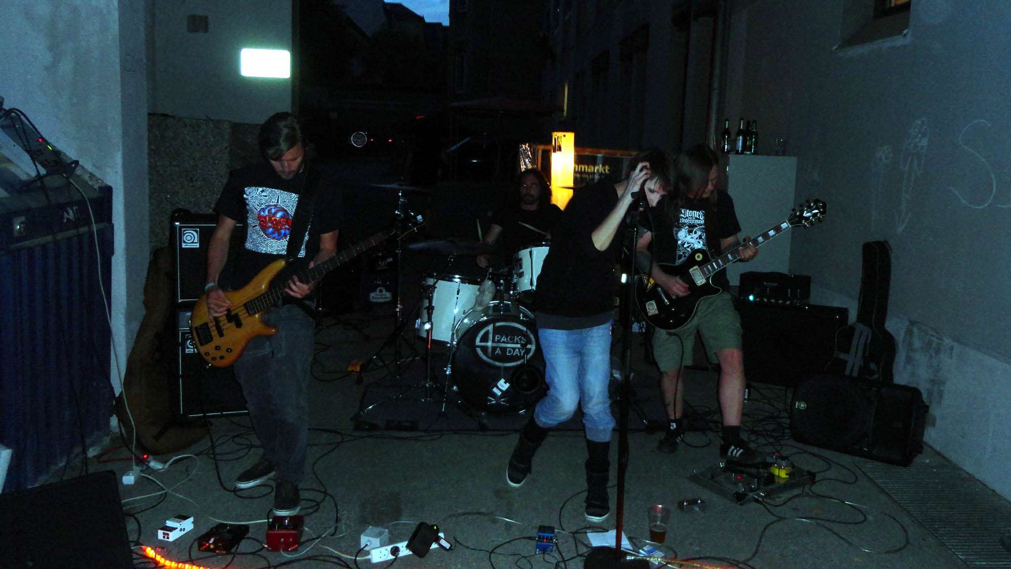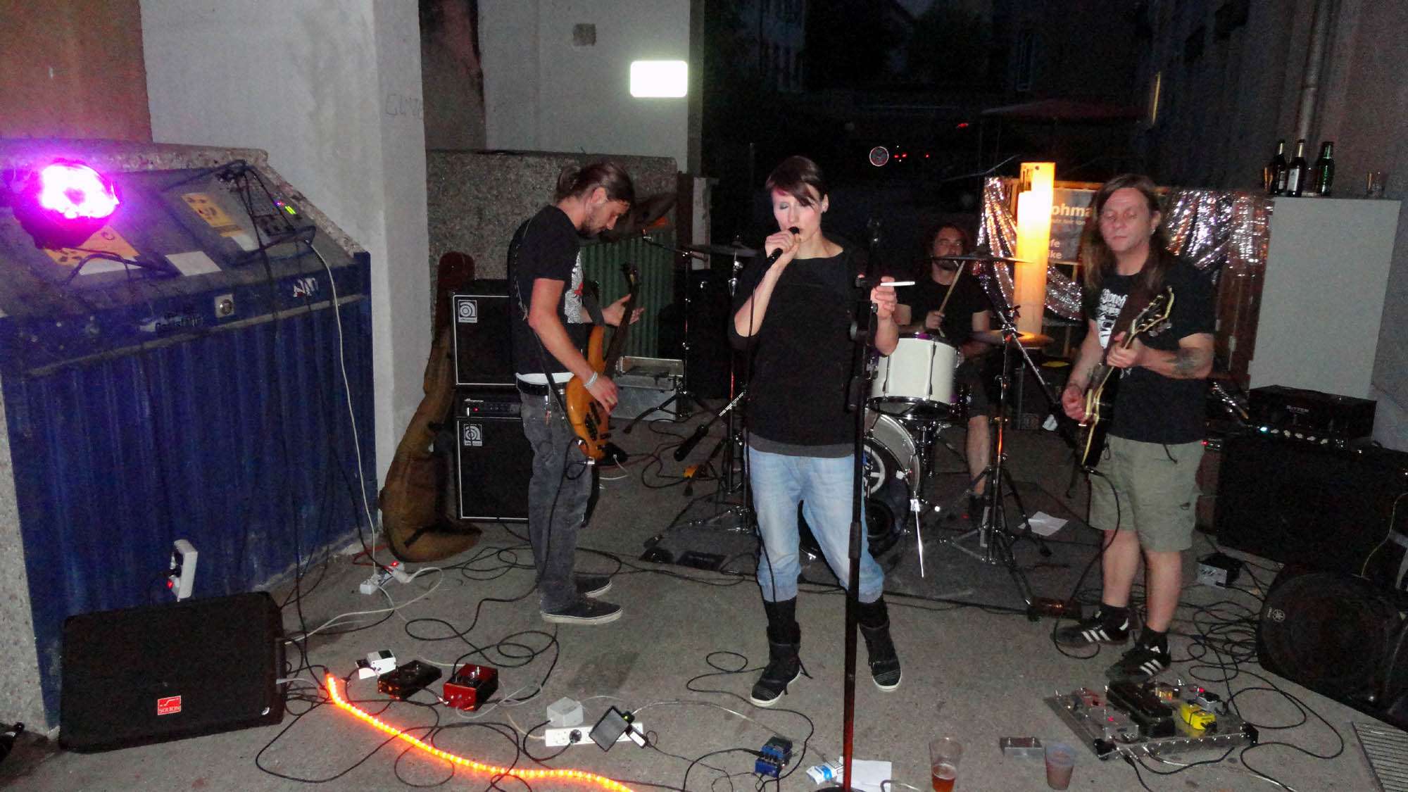 Auf der Böhmischen dann noch eine schöne Begegnung im Hauseingang schrammelt es. Irgendwas zwischen Punkrock und düsteren Grindcore. Ich dränge mich durch. Die Sängerin steckt sich betont lässig eine Kippe an, schnappt sich das Mikro und weiter geht der wilde Beat.