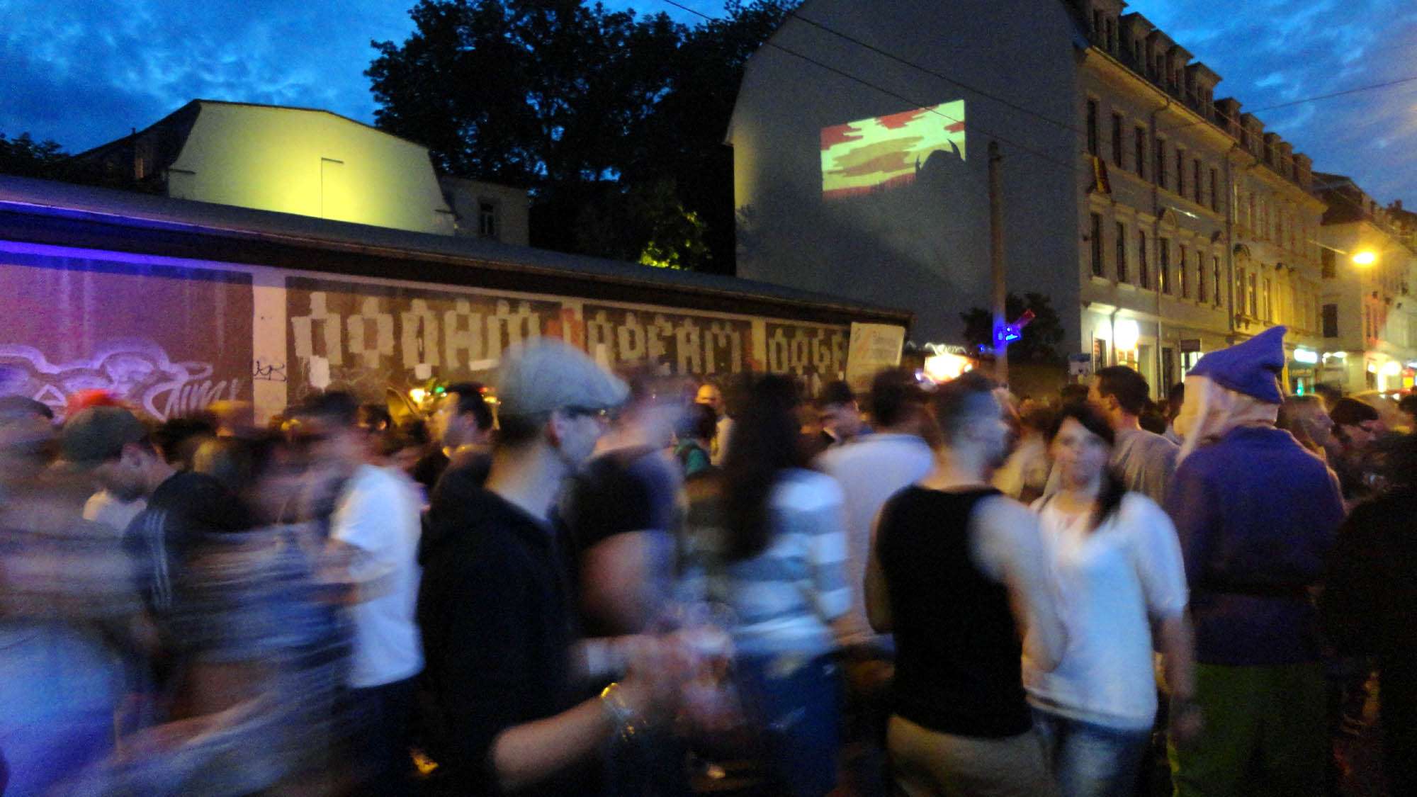 Die Rothenburger steht ganz im Zeichen des Elektrobeats. Irgendwie ist es wie eine umgekehrte Loveparade. Dort ziehen die Trucks mit der Musik vorbei, hier zieht das Volk an den Bass-Türmen entlang. Schlendernd, hüftschwingend, vor-zurück. So geht es auch auf der Görlitzer weiter.