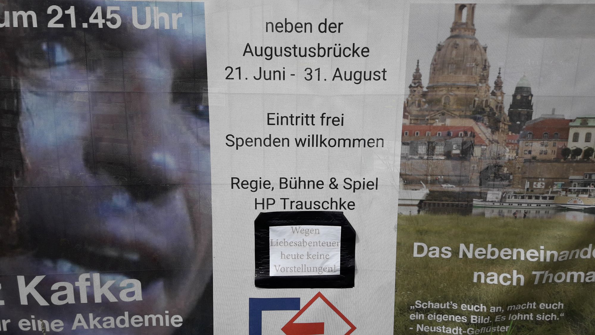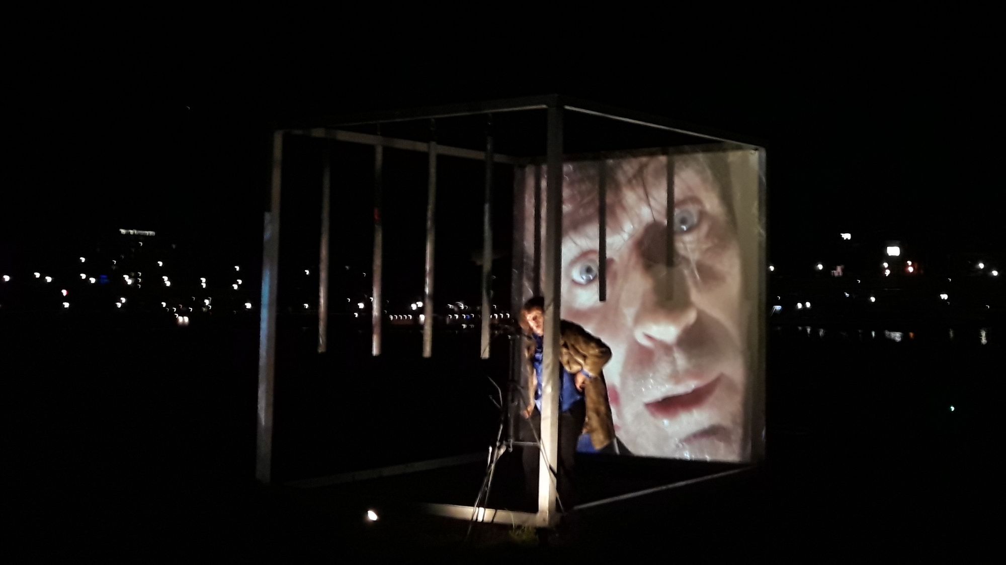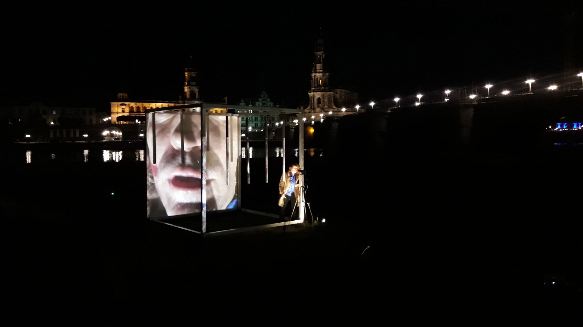 Eine laue Sommernacht im August. Die Elbwiesen liegen im Dunkeln. Dahinter der Fluss und die hell beleuchtete Altstadt. Nah bei der Augustusbrücke ist HP Trauschkes „Artcube“ aufgebaut, ein metallener Käfig als Bühnenbild, darin der Schauspieler, wild gestikulierend, mal laut, mal ganz leise, gefangen in einem Käfig vor wunderschöner Kulisse.