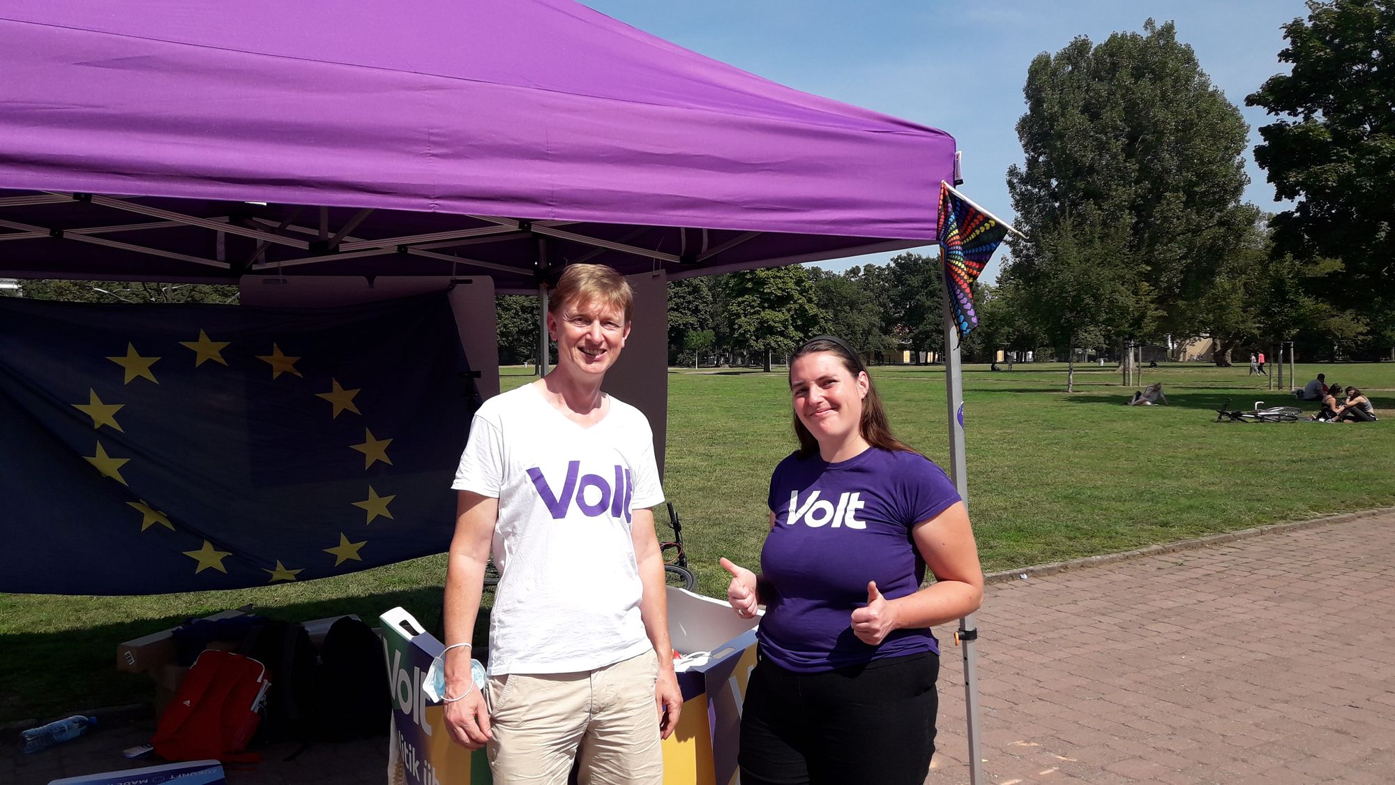 Brünker: Das ist eine sehr städtische Denke. Zum Thema jung: Wir sind von den Mitgliedern vergleichsweise jung. Aber von den Leuten, die uns wählen, sind viele Ältere dabei. Ich unterhalte mich mit über 60-jährigen über Europa. In der Generation ist die Sorge sehr groß, dass das Projekt Europa scheitert. Es ist so, dass du junge Leute schneller motivieren kanns irgendwo aktiv zu werden. Aber die Altersthematik erledigt sich von selbst. Das zeigt sich auch in den Niederlanden: Nach dem Einzug ins Parlament haben wir extrem viele Leute über 50 die in die Partei eintreten. Zum Thema flaches Land: Die Leute auf dem Land werden in der Stadt immer wieder unterschätzt. Die Leute sind wesentlich gebildeter und weltgewandter als man in der Stadt denkt. Auf dem Land fehlt das politische Angebot und da gibt es Wählergruppen, die stehen Volt eigentlich sehr nah. Diese Leute anzusprechen das geht in der Fläche davon bin ich zutiefst überzeugt.