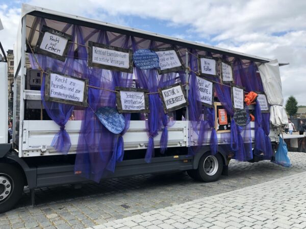 Daneben erinnerte der Menschenrechtswagen daran, dass sich der Oberbürgermeister zwar für Integration ausspreche, sich jedoch weigere Dresden zu einem Sicheren Hafen zu erklären. Um ihn an sein Versprechen von 2015 zu erinnern wurde unter den Demonstrierenden eine Petition herumgereicht mit dem Ziel 10.000 Unterschriften zu sammeln.