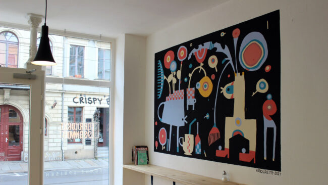 Die Wand am Eingang soll vierteljährlich übermalt werden, und zwar von der jeweiligen kunstschaffenden Person, dessen Gemälde im gesamten Lokal hängen. Momentan ziert eine Malerei von Artourette die Wand, ein der Neustadt nicht unbekannter Anblick. Die urbane Kunst von Artourette findet nun in vier Wänden statt und eröffnet den Auftakt. Hier sollen Kunstausstellungen nicht elitär bleiben, sondern nahbar und alltäglich werden.