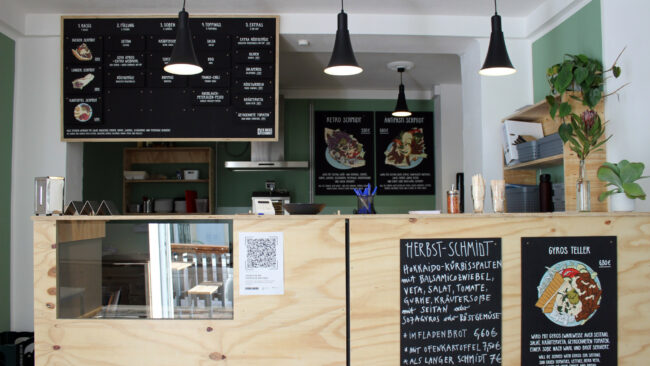 Das Imbiss-Angebot des „Schmidt“ ist einfach. Es gibt einen „Dicken Schmidt“ (Fladenbrot), einen „Langen Schmidt“ (Dürüm-Rolle) und einen „Schmidt mit Kartoffeln“ – das alles kann mit diversen Beilagen wie Grillgemüse oder Saitan oder Hummus kombiniert werden.