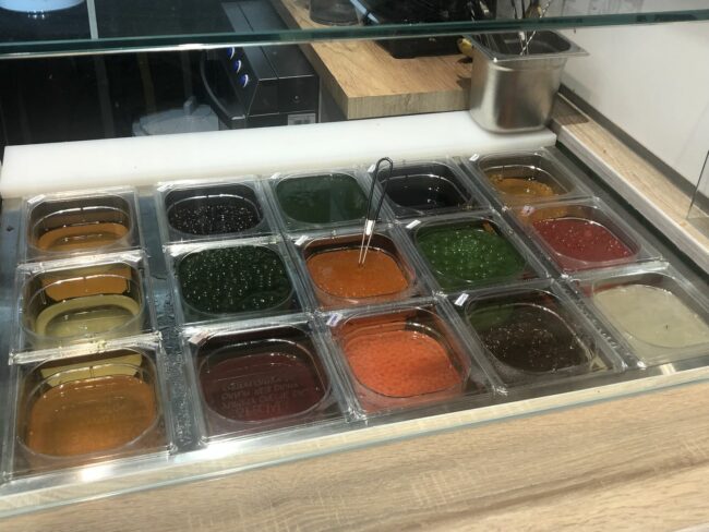 Bei „Yummy“ kann man sich seinen Bubble Tea nach Belieben selbst zusammenstellen oder aus den angebotenen Varianten wählen. Zuerst entscheidet man sich für eine Teesorte und dabei sind die Möglichkeiten sehr vielfältig: Das Angebot reicht von grünem Matcha-, über klassischen Milch-, bis hin zu duftendem Jasmin-Tee.