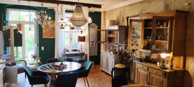 Und wieder geht es rüber auf die andere Seite. Hier versammeln sich jetzt die Klamottenlädchen, in „Doppellotte“ und „Unipolar“ kann man sich mit fairer Kleidung eindecken. Verschnaufpausen können in der Badewanne direkt vorm „Unipolar“, oder bei einem Zwischenstopp im „Atelier Zeitgold“ abgehalten werden. Hier gibt es nicht nur leckeren Kaffee und veganes Gebäck, sondern die extravagante Einrichtung im Retrodesign steht ebenfalls zum Verkauf.