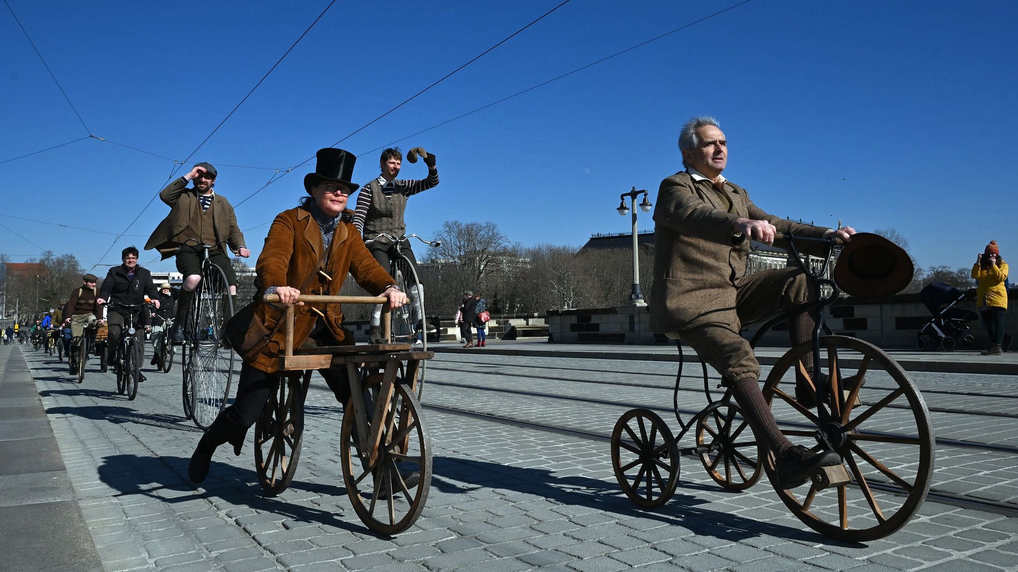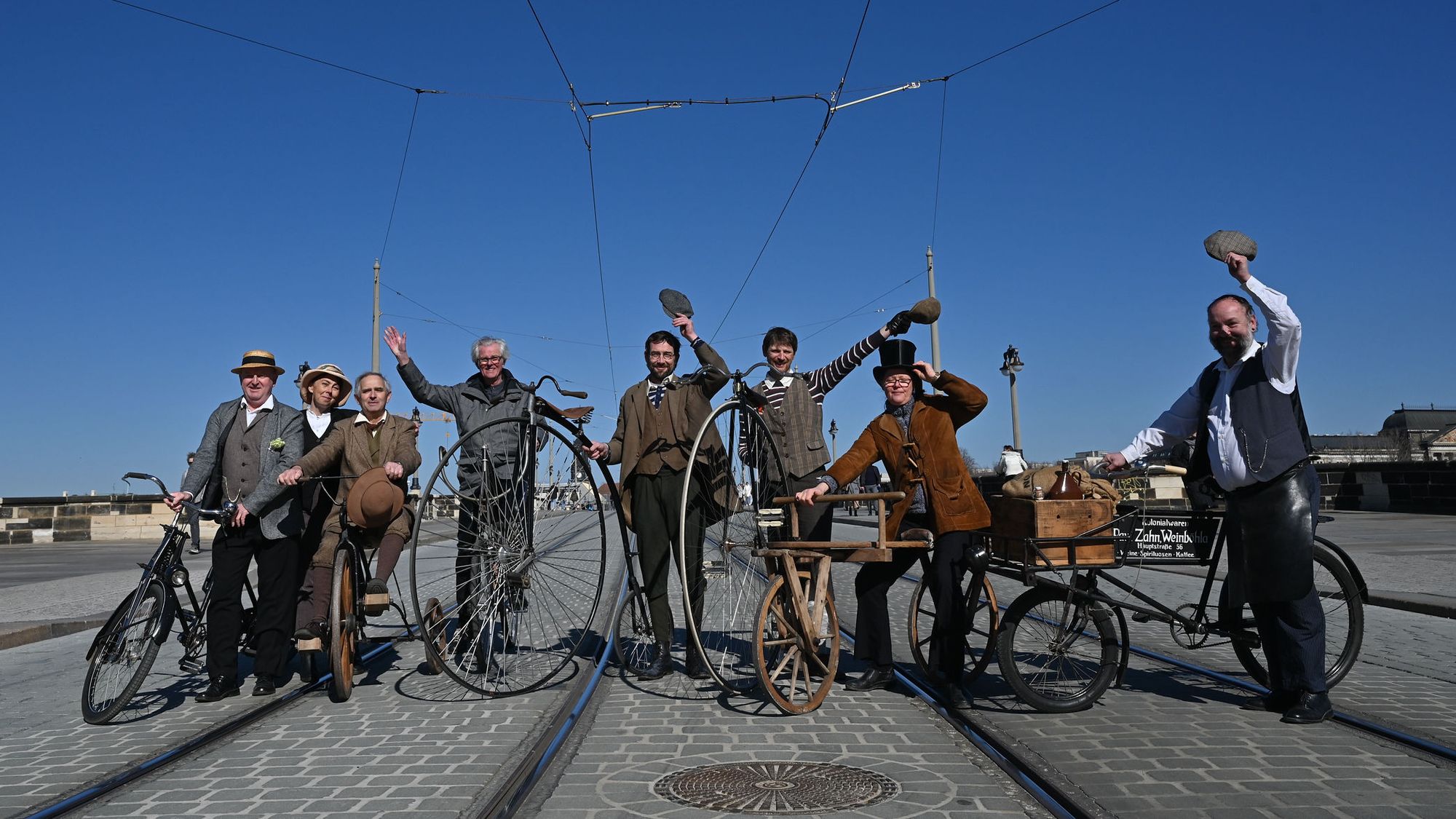Gemeinsam mit dem Fahrrad-Veteranen-Freunde Dresden e. V. sowie dem Radfahrerverein Weinböhla e.V. und ihren historischen Fahrrädern sowie passend historischen Gewändern trat der ADFC Dresden auf der Brücke in die Pedale und genoss so den breiten Raum für den Radverkehr auf der etwas mehr als 100 Jahre alten Brücke.