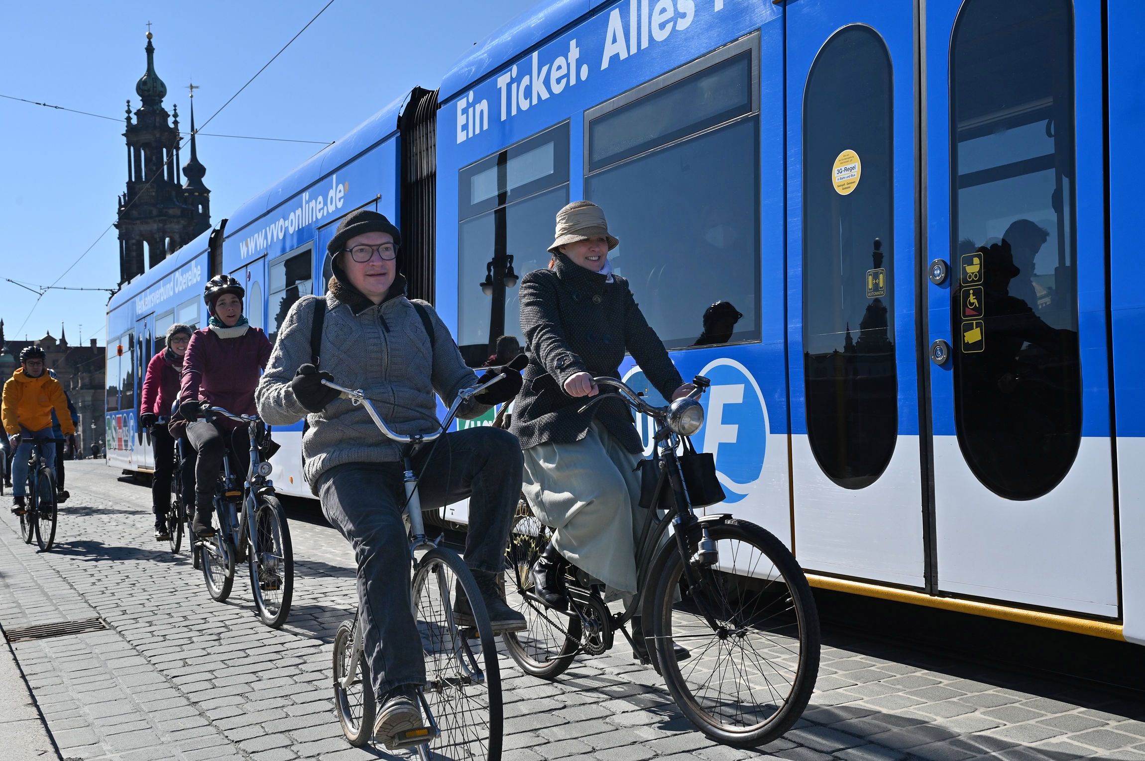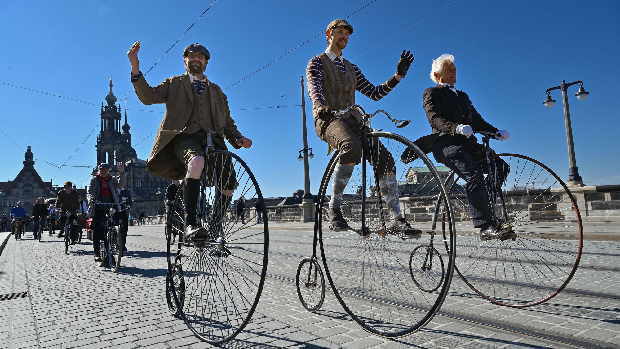 Wichtig beim Befahren der Brücke mit dem Rad ist, dass nun nicht mehr auf den Gehwegen gefahren wird, sondern auf der Fahrbahn. Das demonstrierte der kleine Pulk mit seinen historischen und zeitgenössischen Fahrrädern am Sonnabend. Zwar sei das für viele Radfahrer*innen noch ungewohnt und manche würden fälschlicherweise weiter auf dem Gehweg fahren, sagt Seifert. Aber mit der fertigen Sanierung sind die Baustellenverhältnisse mit ihren gemeinsamen Geh- und Radwegen zu Ende gegangen. „Jetzt, und das ist wirklich eine neue Epoche für die Augustusbrücke, haben die Radfahrer*innen den weiten Raum der Fahrbahn zu ihrer Verfügung, wobei natürlich der Straßenbahn Platz zu machen ist“, so Seifert.