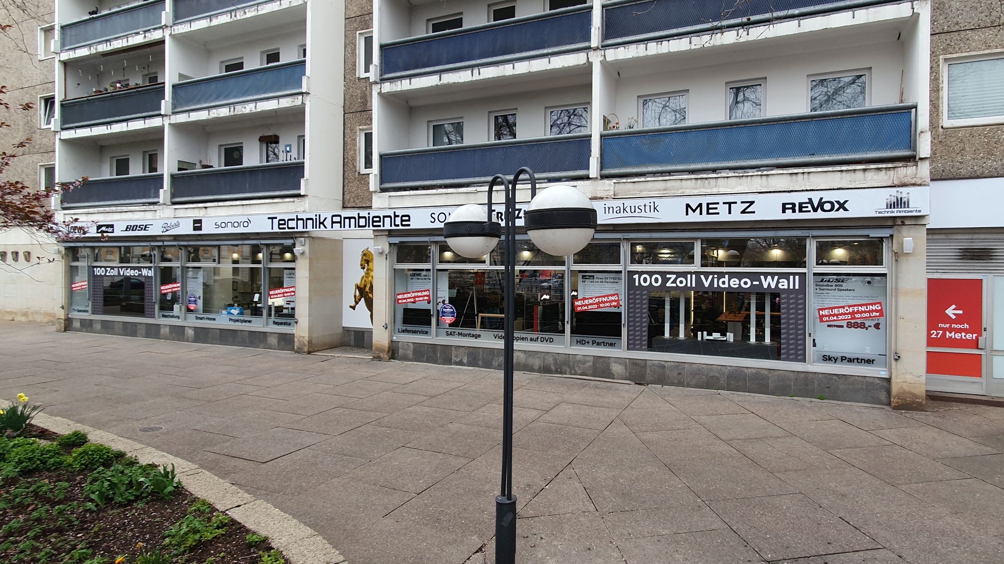„Wir haben erstmal ordentlich vorgerichtet“, sagt Arndt, dem die Freude über die Neueröffnung ins Gesicht geschrieben steht. Und tatsächlich in dem Laden hier ist Platz für riesige Fernseher. Der Größte ist eine Kombination aus vier Bildschirmen und misst eine Diagonale von rund 110 Zoll, knapp 2,80 Meter. Damit kann man schon einen größeren Kneipengastraum ausstatten. Im Technik-Ambiente gibt es ausschließlich hochwertige und auch ziemlich preisintensive Marken. Am Premium-Platz steht ein Loewe-Fernseher für mehr als 10.000 Euro. Offenbar hat Arndt damit eine Nische gefunden. „Solche Geräte werden nicht im Internet gekauft“, weiß er.
