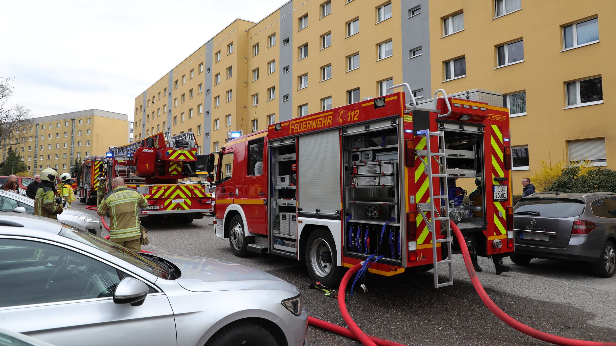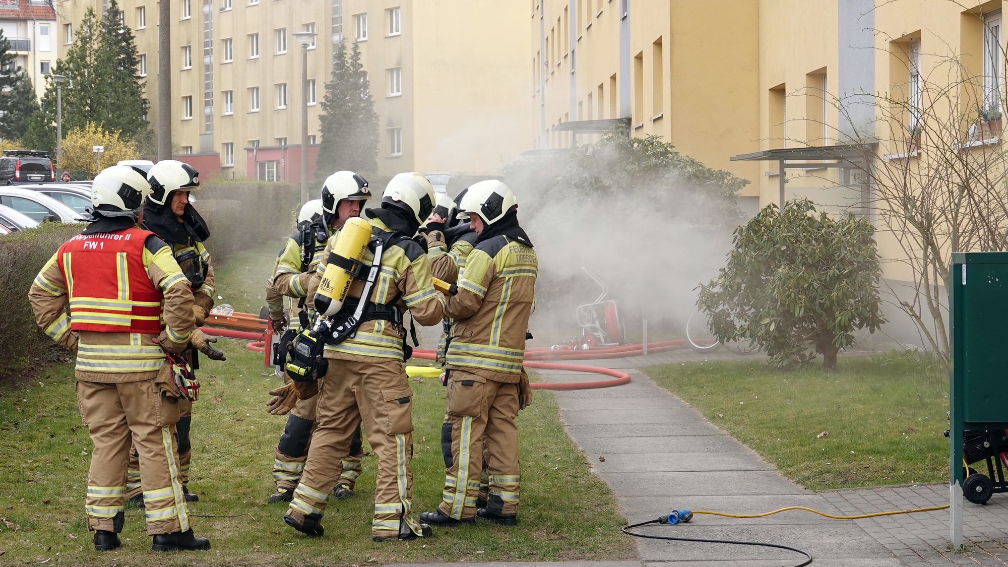 Als die Dresdner Feuerwehr gegen 15.30 Uhr die Einsatzstelle erreichte, drang dichter Rauch aus dem Keller zu beiden Seiten des Gebäudes nach außen. Sofort gingen mehrere Trupps unter Atemschutz zur Brandbekämpfung im Keller vor. Dort brannte eine Kellerbox in voller Ausdehnung. Mit einem Strahlrohr wurde die Brandbekämpfung aufgenommen. Der Brandrauch hatte sich bereits in das Nachbargebäude, mehrere Wohnungen sowie den gesamten Treppenraum ausgebreitet.