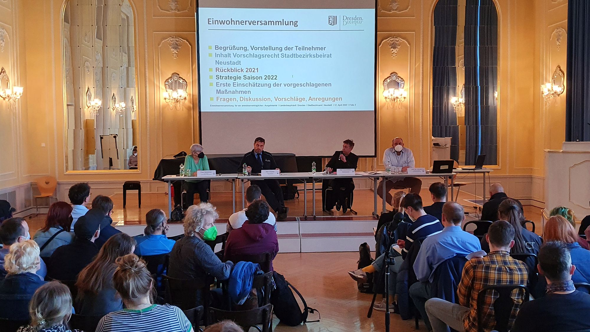 Stadtbezirksamtsleiter André Barth fehlte aus gesundheitlichen Gründen, ihm sei eine rasche Genesung gewünscht. Stellvertretend leitete der Pieschener Amtsleiter Thomas Grundmann die Sitzung. Mit der Neustadt kennt er sich gut aus, war er doch lange Jahre hier Ortsbeirat für die Linke. Ihm zur Seite saßen Johannes Schulz vom Kriminalpräventiven Rat Dresden, Revierleiter Sven Fischer und Jutta Gerschner vom Ordnungsamt.