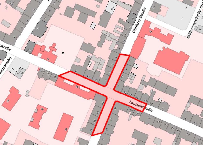 Die Verordnung soll gelten von Louisenstraße 45 bis Louisenstraße 57, Louisenstraße 42 bis Louisenstraße 46, Rothenburger Straße 42 bis Görlitzer Straße 6, Rothenburger Straße 37 bis Görlitzer Straße 7. Siehe Lageplan. Genehmigte Außenbewirtschaftungsflächen sind ausgenommen.