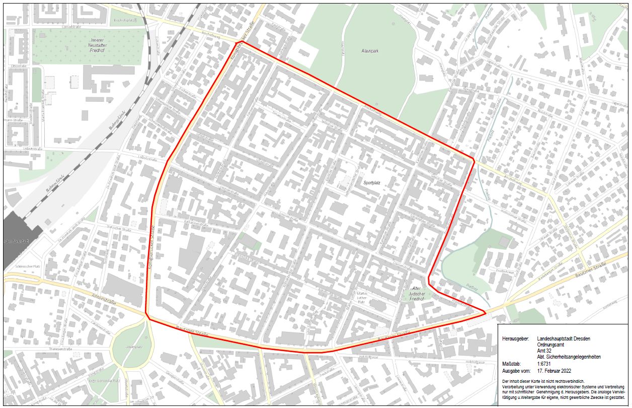 Es geht zum einen um ein zeitlich begrenztes Alkoholabgabeverbot über die Straße in der gesamten Äußeren Neustadt und ein ebenefalls zeitlich begrenztes Alkoholkonsumverbot an der Ecke Rothenburger, Görlitzer, Louisenstraße.