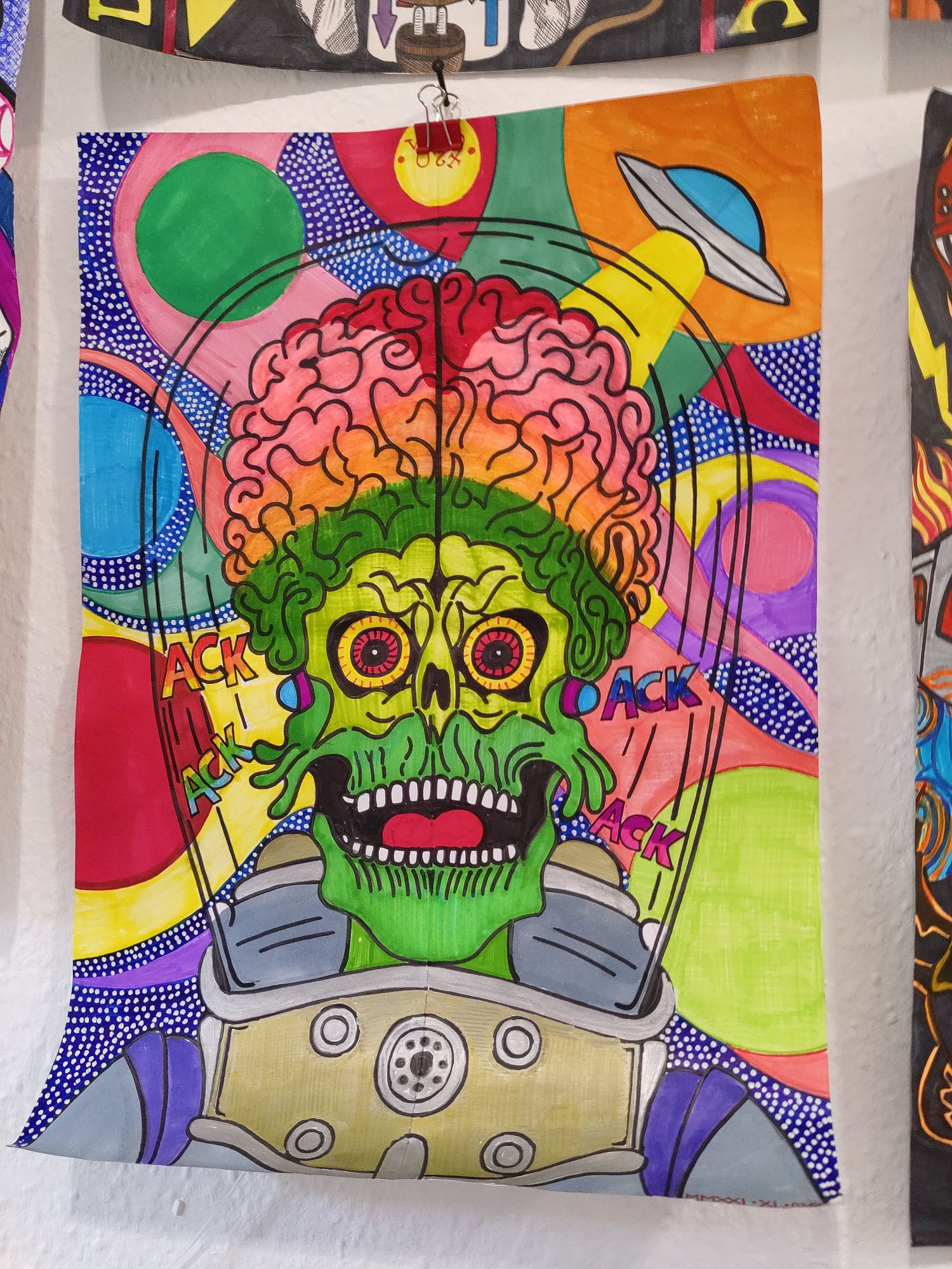 Zum einen zeigt die „666 % Underground Trash Art“ die Corona Chronicles II mit psychedelischer, okkulter Kunst – also viel Bunt, Einlassposter der Chemiefabrik, Cover, Artworks, T-Shirt-Designs, Filzstiftposterartist, 420 Künstler, Analogkopierer und Musikfanatiker unter dem Titel „Goat ov Pike“ (Ziege oder Hecht).