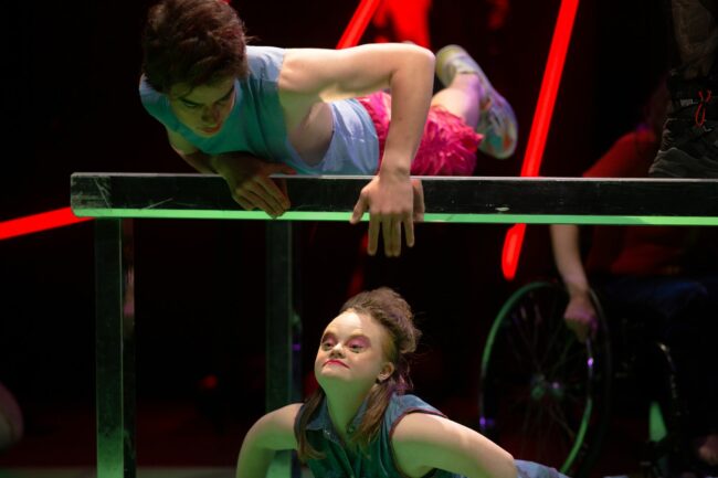 Die Tänzer*innen der inklusiven Company gingen im wahrsten Wortsinne über Tische und Bänke und erweckten mit übersprudelnder Energie sogar einen lebensgroßen Plüschbären aus dem Winterschlaf. „No Name“ erobert dynamisch die Grenzverläufe zwischen Horizontale und Vertikale und knackt Schubladen auf.