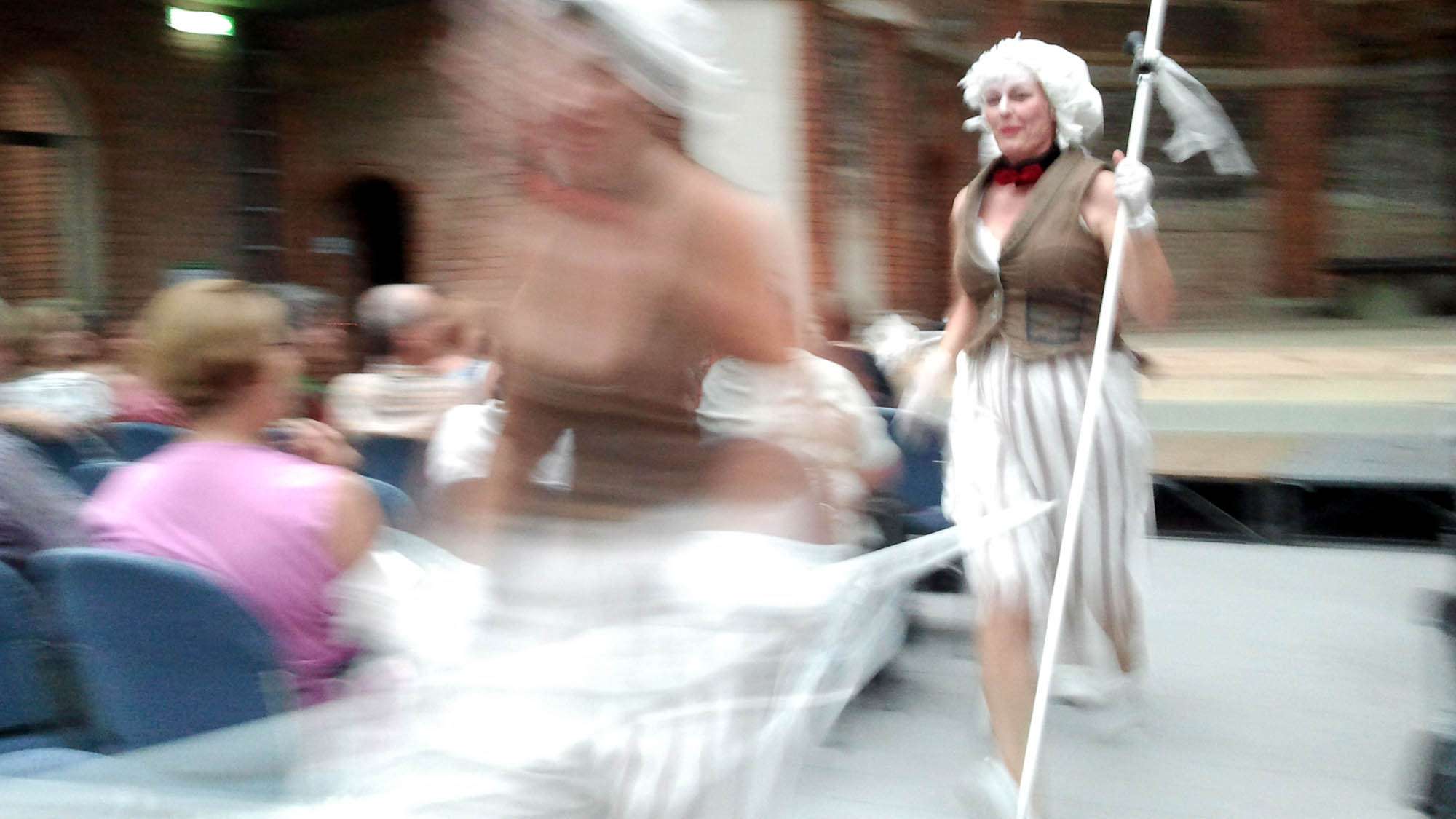 Ich bin mittendrin. Die Schauspieler nutzen den ganzen Raum, vor und hinter mir eilen sie vorbei. Das Lustspiel von Pierre-Augustin Caron de Beaumarchais wurde so richtig bekannt, weil Wolfgang Amadeus Mozart vor mehr als 200 Jahren eine Oper daraus schuf. Heute aber gibt es richtiges Theater. In herrlich altmodischer Sprache mit altmodischen Kostümen. Wunderbar. Es wird geschrien, gezetert, gedroht und intrigiert, was das Zeug hält. Es geht um die Liebe, ums Betrügen, um Eitelkeit, das Betrogen werden und um Eifersucht, die laut Figaro doch nur eine Raserei sei. Zumindest solange, bis er sie selbst erlebt.
